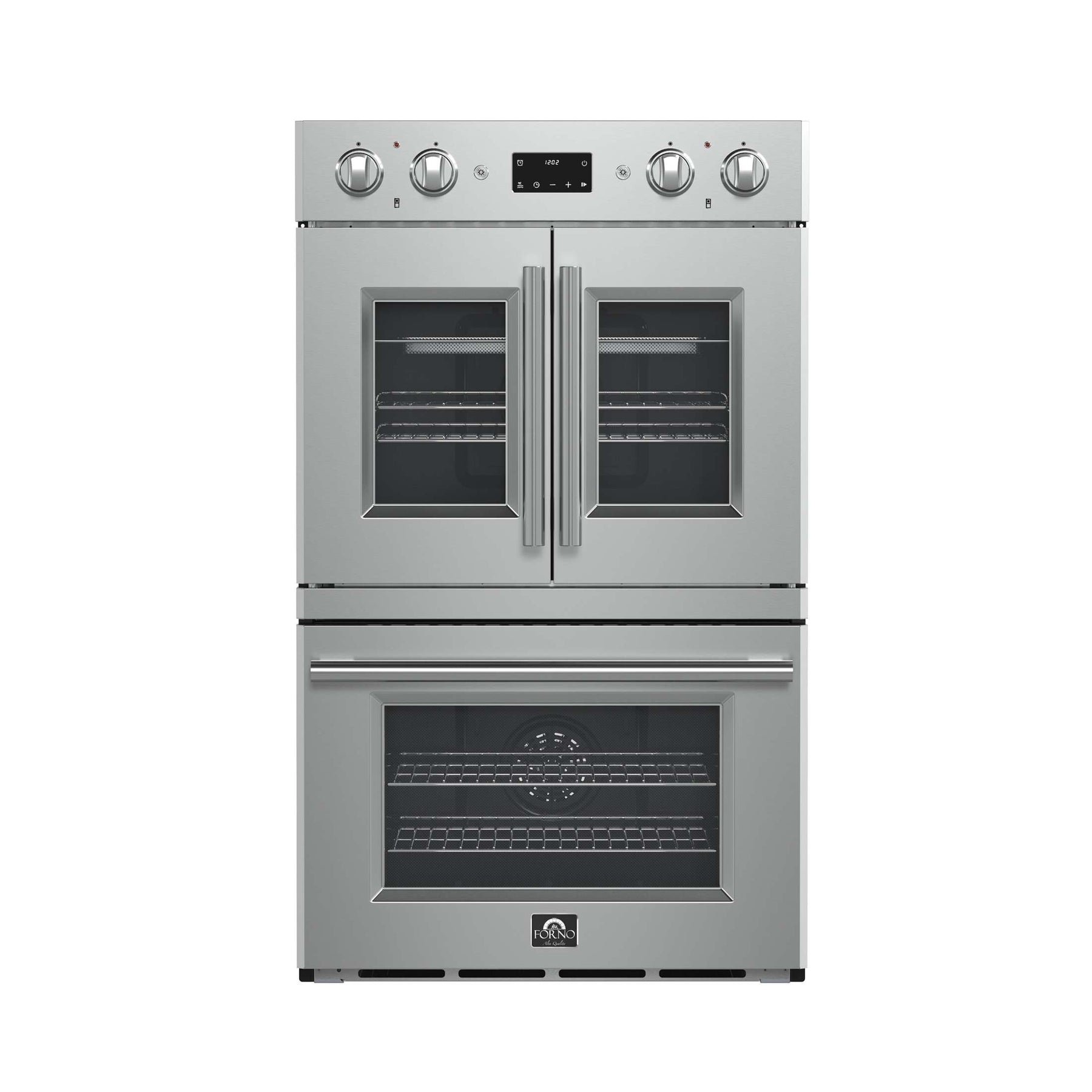 The Forno Asti 30” Double Wall Oven combines elegance and performance with a French-door top oven for effortless, one-handed access. Featuring 7.36 cu. ft. of true convection cooking, it ensures even heat distribution for perfect baking results. The built-in air-fry function delivers crispy textures with minimal oil, while precision control knobs provide a hands-on approach to cooking. A digital LED display offers seamless management of the timer and Sous Vide function, enhancing precision and versatility. Designed for convenience, the self-cleaning mode simplifies maintenance, keeping your oven spotless with minimal effort.