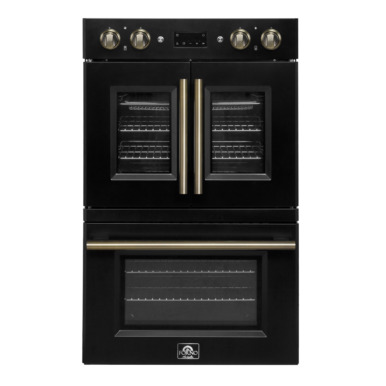 The Forno Asti 30” Double Wall Oven in black with anitque brass accessories combines elegance and performance with a French-door top oven for effortless, one-handed access. Featuring 7.36 cu. ft. of true convection cooking, it ensures even heat distribution for perfect baking results. The built-in air-fry function delivers crispy textures with minimal oil, while precision control knobs provide a hands-on approach to cooking. A digital LED display offers seamless management of the timer and Sous Vide function, enhancing precision and versatility. Designed for convenience, the self-cleaning mode simplifies maintenance, keeping your oven spotless with minimal effort.
