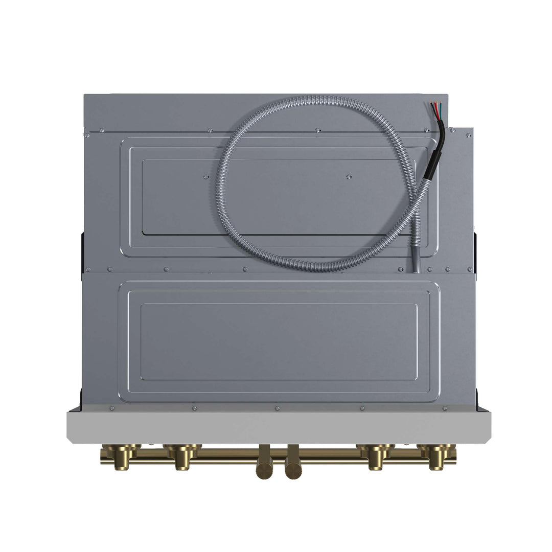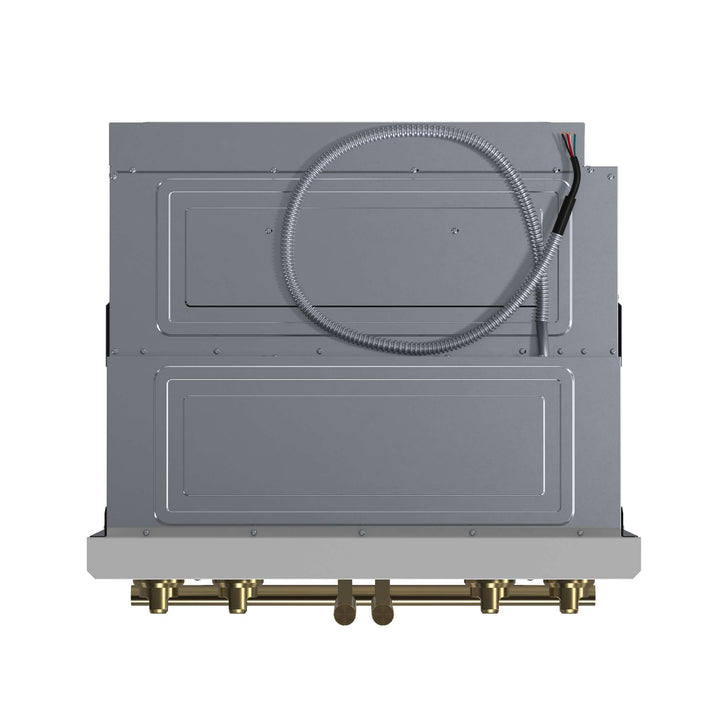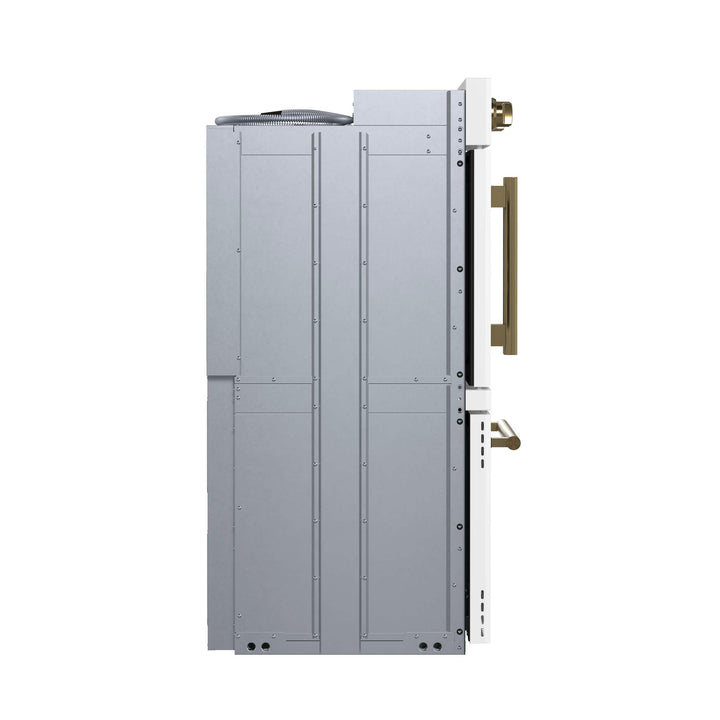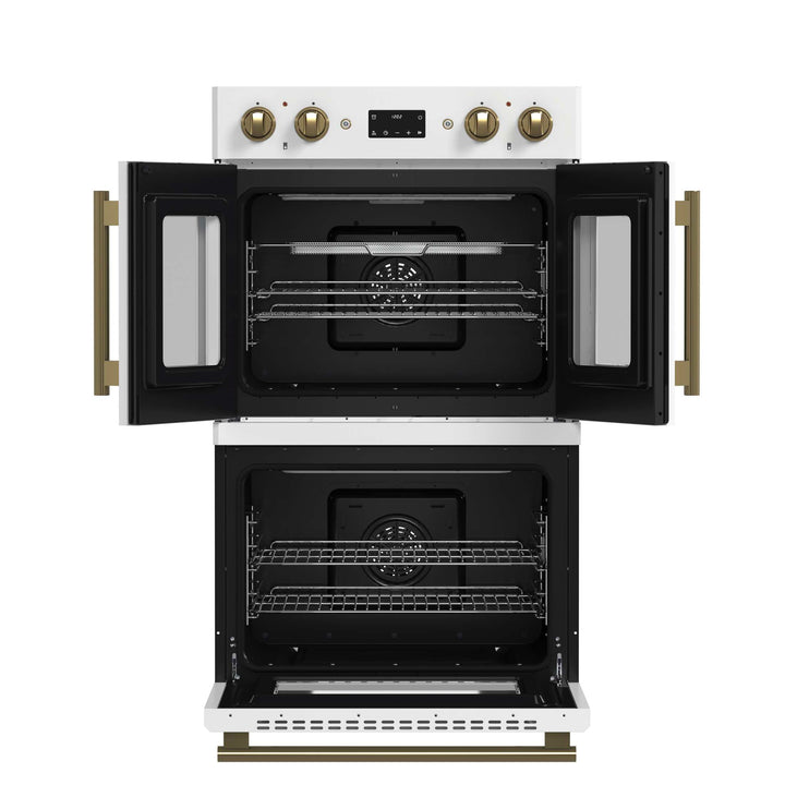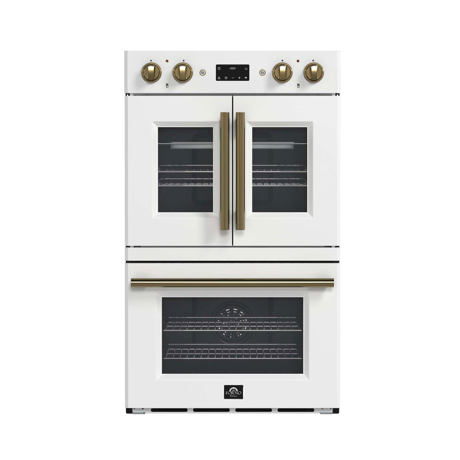 The Forno Asti 30” Double Wall Oven in white with anitque brass accessories combines elegance and performance with a French-door top oven for effortless, one-handed access. Featuring 7.36 cu. ft. of true convection cooking, it ensures even heat distribution for perfect baking results. The built-in air-fry function delivers crispy textures with minimal oil, while precision control knobs provide a hands-on approach to cooking. A digital LED display offers seamless management of the timer and Sous Vide function, enhancing precision and versatility. Designed for convenience, the self-cleaning mode simplifies maintenance, keeping your oven spotless with minimal effort.