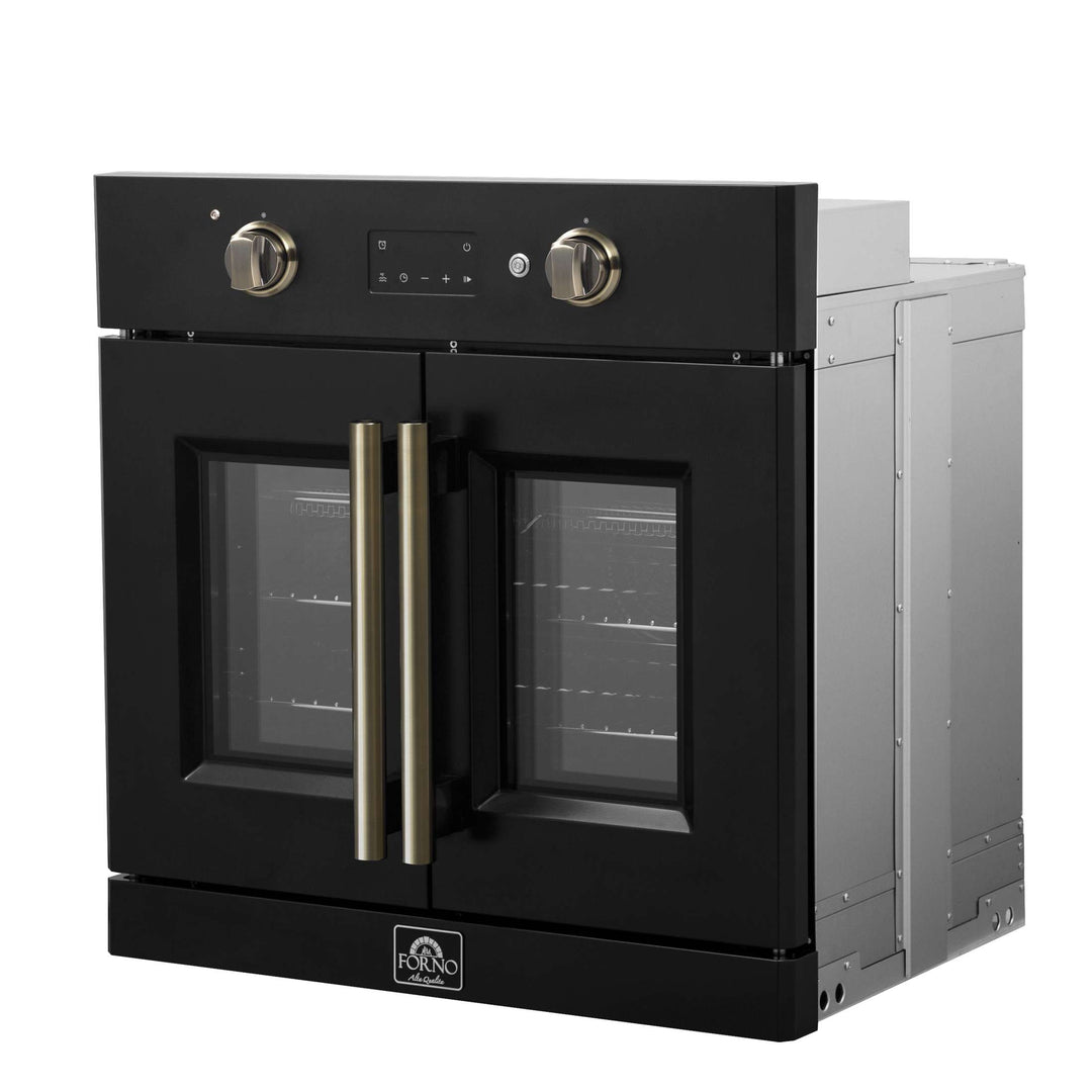 Timeless elegance meets exceptional performance with the Forno Asti 30” French Door Wall Oven in black with antique brass accents. The 3.68 cu. ft. true convection oven guarantees a perfectly even cooking temperature, and the French door allows for easy one-handed access. Cook healthier meals with the integrated air-frying function, delivering a crispy meal with very little oil. Precision knobs ensure an optimum selection of functions and temperatures, while LED digital displays make it easy to adjust the timer and sous-vide mode. The black enamel interior resists stains, and the self-cleaning mode eliminates the inconvenience of manual cleaning. Created for those who appreciate a blend of sophistication and performance, this oven transforms any kitchen at an affordable price.
