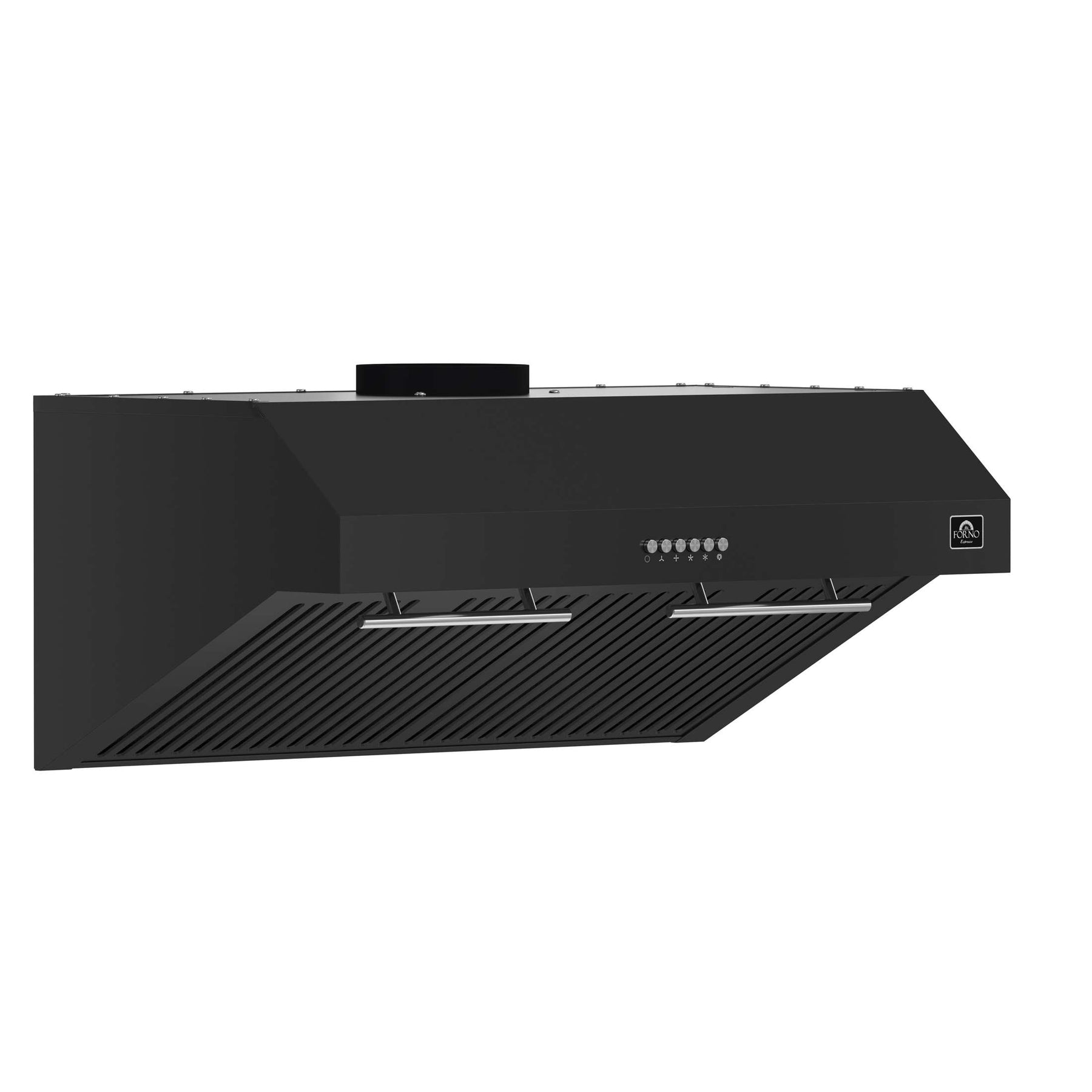 Forno presents the Bari 30 Inch Espresso Range Hood, an exceptional under cabinet range hood that boasts an elegant black finish, adding a touch of sophistication to your kitchen space. With its powerful 400 CFM airflow, this range hood efficiently eliminates cooking odours, smoke, and airborne grease, ensuring a fresh and clean environment. The user-friendly 4 speed push button control allows you to adjust the ventilation settings effortlessly, providing optimal performance tailored to your needs. Illuminate your cooking area with two built-in LED surface lights, offering bright and even lighting for a delightful culinary experience. Equipped with a durable baffle and mesh filter, this range hood effectively traps grease and debris, ensuring easy maintenance and prolonging the lifespan of the appliance. Choose between the provided antique brass or stainless steel handles to customize the filters. Upgrade your kitchen with the versatile and high-performing under cabinet range hood from Forno, where style meets functionality.