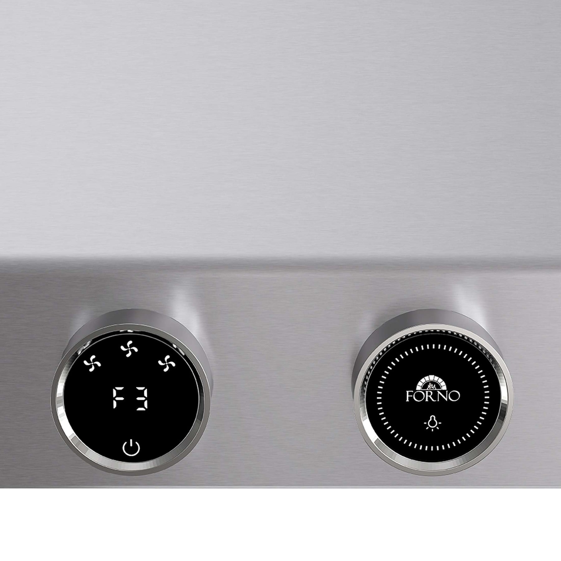 The Forno Biagio 30" Wall-Mounted Range Hood combines efficient smoke and odor removal with a modern stainless steel finish. Its 600 CFM single motor ensures strong yet quiet performance, while heavy-duty, dishwasher-safe baffle filters trap grease for easy cleaning. Designed for 30" cooktops, it features a 3-speed fan, intuitive knob controls, and dimmable LED lighting for a well-lit, customized cooking experience. The power-off delay clears lingering steam, and its versatile installation allows for wall-mounted or under-cabinet setups.