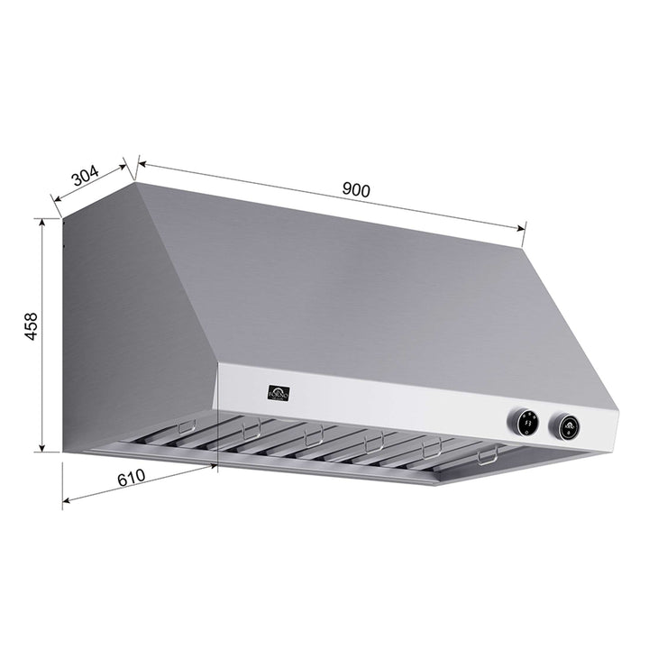 The Forno Biagio 36" Wall-Mounted Range Hood combines efficient smoke and odor removal with a modern stainless steel finish. Its 600 CFM single motor ensures strong yet quiet performance, while heavy-duty, dishwasher-safe baffle filters trap grease for easy cleaning. Designed for 36" cooktops, it features a 3-speed fan, intuitive knob controls, and dimmable LED lighting for a well-lit, customized cooking experience. The power-off delay clears lingering steam, and its versatile installation allows for wall-mounted or under-cabinet setups.
