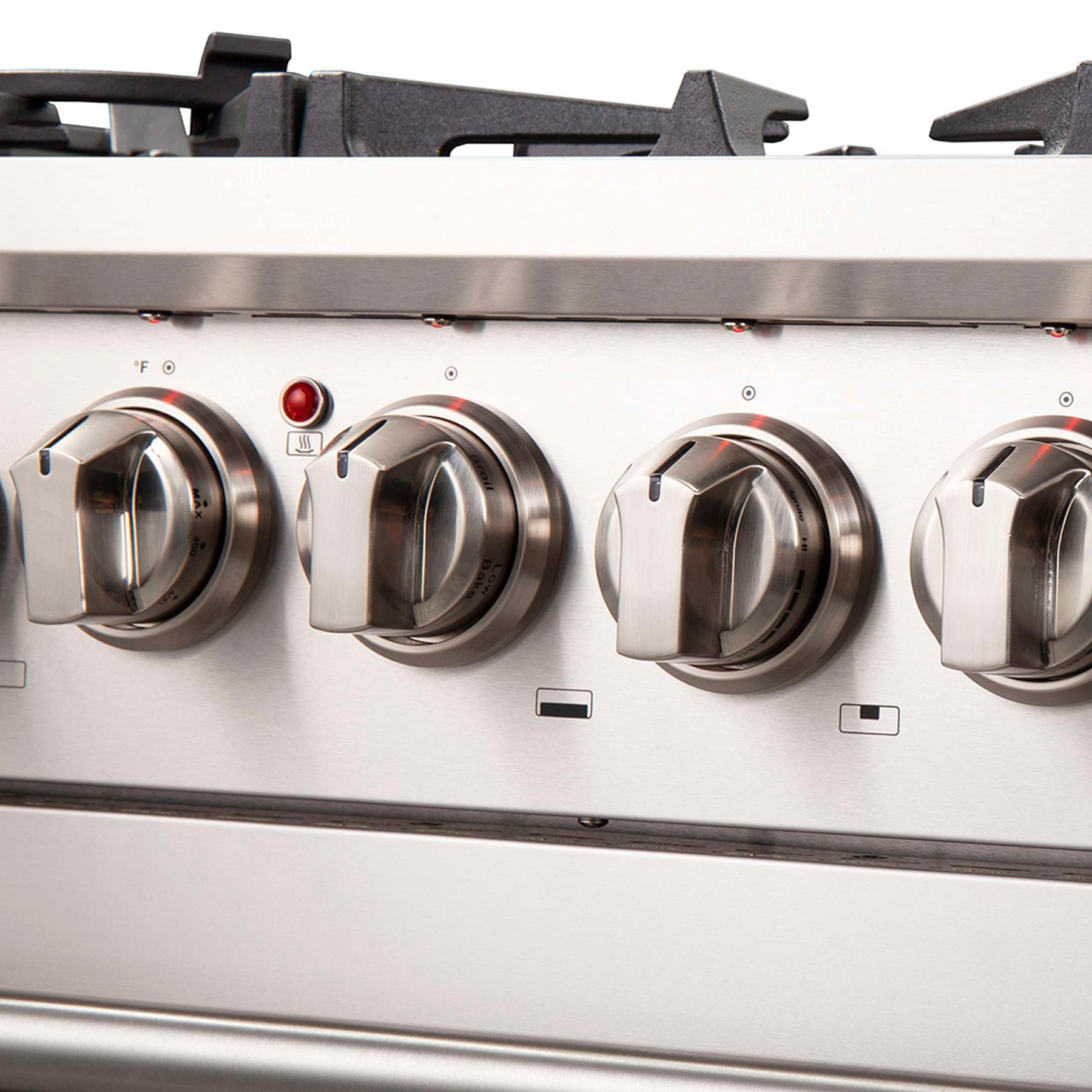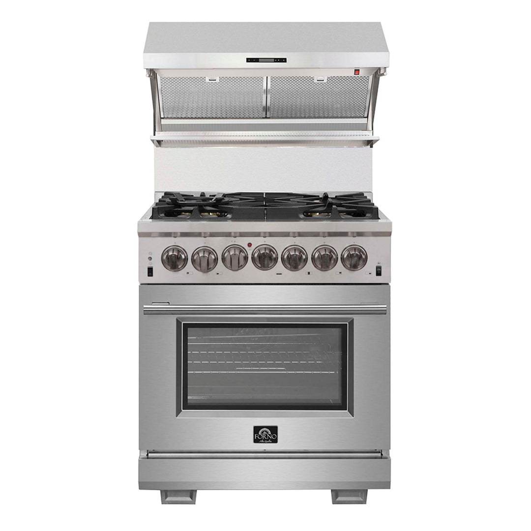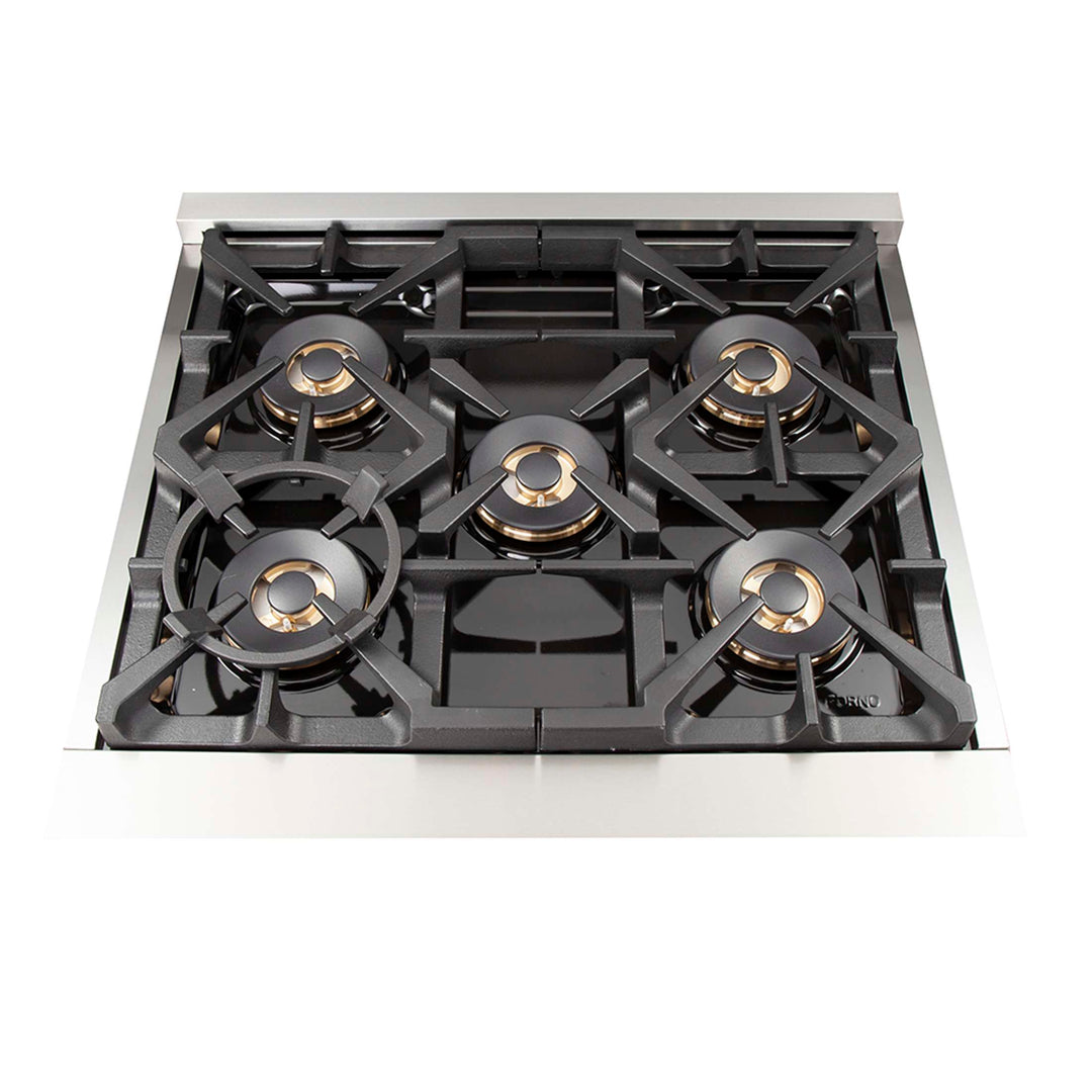 The Forno 30 Inch Capriasca Dual Fuel Range brings professional styling and Performance into your home kitchen with its durable and beatiful 304 grade stainless-steel design. Cooking surface has 5 sealed dual-ring brass burners with a total output of 100,000 BTU. 20K dual-ring burner for boiling or searing and is able to perform simmering like melting chocolate or sauces, Continuous heavy-duty cast-iron grates allow for easily sliding pots or pans off heat when desired. This 4.32 cu.ft. true convection fan oven has an impressive blue enamel interior, allowing for easy cleaning. The 3-layer glass oven door window provides both heat retention and an unobstructed view. This oven also boasts a total output of 6,300 Watts, providing plenty of power for baking, roasting, and broiling. Included are 3 fully telescopic easy access stainless steel oven racks, concave Wok Ring and LP conversion kit. Additionally, zinc coated metal knobs with bezel rings will maintain their beauty for years.