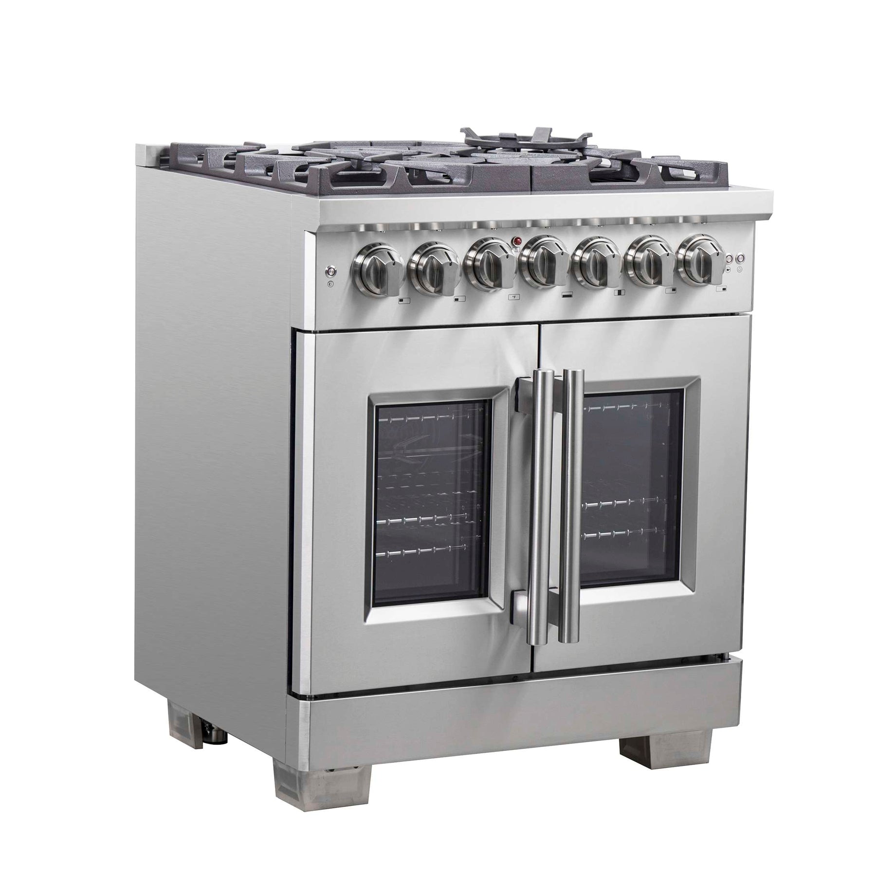 The Forno Capriasca 30-Inch french door dual fuel range harmonizes professional styling and performance into your home kitchen with its durable stainless-steel design. Unique french doors mean open doors allow up to 12 Inch of more space to access your oven. The gas range-top has 5 sealed dual-ring brass burners with a total output of 100,000 BTU for simmering melting chocolate or simmering sauces, 20K dual-ring burner for boiling or searing and is able to perform simmering like melting chocolate or sauces. The heavy-duty continuous cast iron grates allow maximum stability of cookware and mobility over a recessed enamel Cooking Surface cavity which keeps spills and splashes contained and easy to clean. The 4.32 cu. ft. electric oven with a total output of 6,300 Watts is encased in a speckled blue enamel interior fitted with a true convection fan, ensures to achieve fast, precision and consistent oven cooking along for easy viewing is a 3-layer glass oven door window. Included is an LP conversion kit, 3 stainless steel telescopic oven racks, wok-ring, reversible griddle, rotisserie kit and skewers forks, air fry basket with rack and drip pan. Additionally, zinc coated metal knobs with bezel rings will maintain their beauty for years.