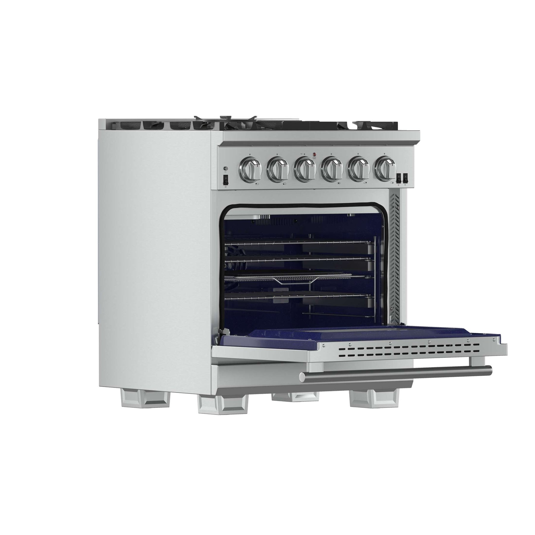 The Forno Capriasca 30 Inch Gas Range enhances your home kitchen with professional styling and performance through its durable and beautiful 304-grade stainless-steel design. The cooking surface features 5 sealed dual-ring brass burners, totaling 100,000 BTU. All burners, each at 20,000 BTU, can simmer precisely at 1,000 BTU. Continuous heavy-duty cast-iron grates facilitate easy sliding of pots or pans off heat over the enamel cooktop cavity, simplifying spill cleanup. The 4.32 cu. ft. gas oven, with a 30,000 BTU output and infrared red mesh broiler, enclosed in a blue enamel interior, offers optional convection for precise, and consistent cooking on multiple levels. For convenient viewing, a 3-layer glass oven door window is included. The package includes 3 telescopic stainless-steel oven racks, wok support, and an LP conversion kit. Additionally, zinc-coated illuminated metal knobs with bezel rings ensure enduring beauty.