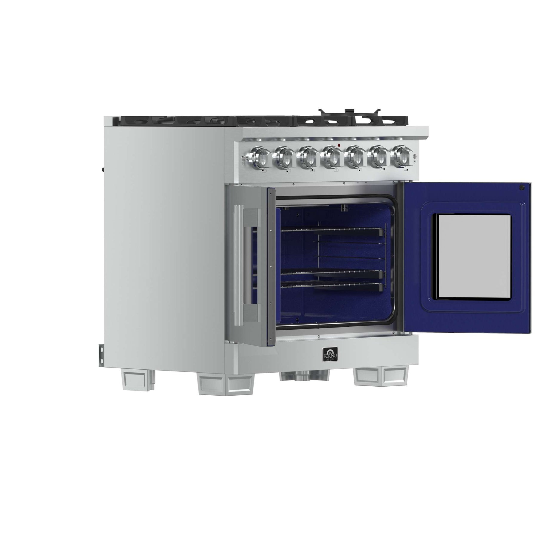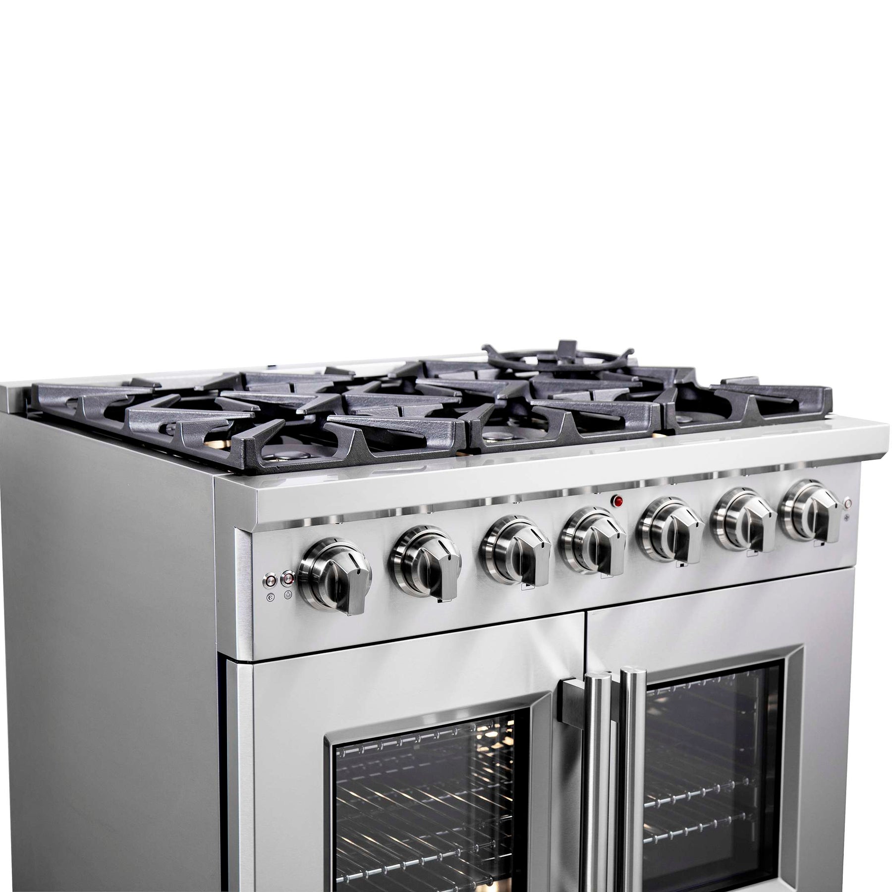 The 36 Inch Forno Capriasca French Door Gas Range elevates your home kitchen with professional style and performance. Crafted from durable stainless steel, its unique French doors provide an extra 12 Inch of access space to the oven. The range top boasts 6 sealed dual-ring brass burners, delivering a total output of 120,000 BTU for precise tasks like simmering or melting chocolate. The heavy-duty continuous cast iron grates ensure stability, covering a recessed enamel cooking surface cavity that contains spills for easy cleaning. The 5.36 cu. ft. gas oven, with a 30,000 BTU output, features a speckled blue enamel interior, convection fan, and a 3-layer glass oven door window for fast and precise cooking. The package includes an LP conversion kit, 3 stainless steel telescopic oven racks, wok support, reversible griddle, rotisserie kit, skewers forks, air fry basket and drip pan. The illuminated zinc-coated metal knobs with bezel rings add a touch of elegance that lasts for years.