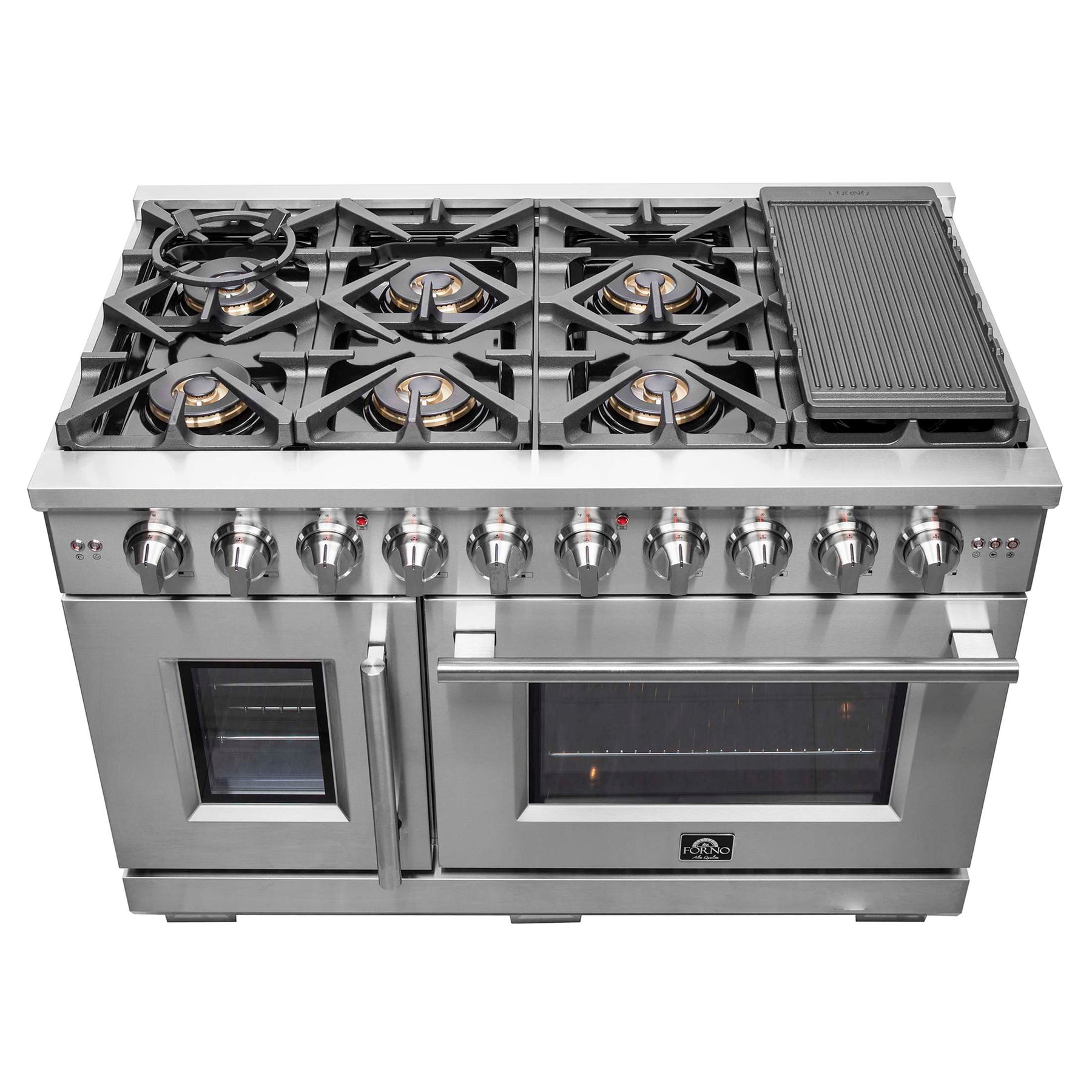 The Forno Capriasca 48 Inch French Door Gas Range enhances your home kitchen with professional styling and performance through its durable and beautiful 304-grade stainless-steel design. The cooking surface features 8 sealed dual-ring brass burners, totaling 160,000 BTU. All burners, each at 20,000 BTU, can simmer precisely at 1,000 BTU. Continuous heavy-duty cast-iron grates facilitate easy sliding of pots or pans off heat over the enamel cooktop cavity, simplifying spill cleanup. The 6.58 cu. ft. double ovens, with a 44,000 BTU output, are enclosed in a blue enamel interior. The 4.32 cu.ft. main oven offers a powerful 10,000 BTU infrared mesh broiler, a rotisserie skewer and a convection fan for precise, and consistent cooking on multiple levels. The package includes 6 telescopic stainless-steel oven racks, 1 rotisserie kit, wok support, griddle, air-fryer kit and an LP conversion kit. Additionally, zinc-coated illuminated metal knobs with bezel rings ensure enduring beauty.
