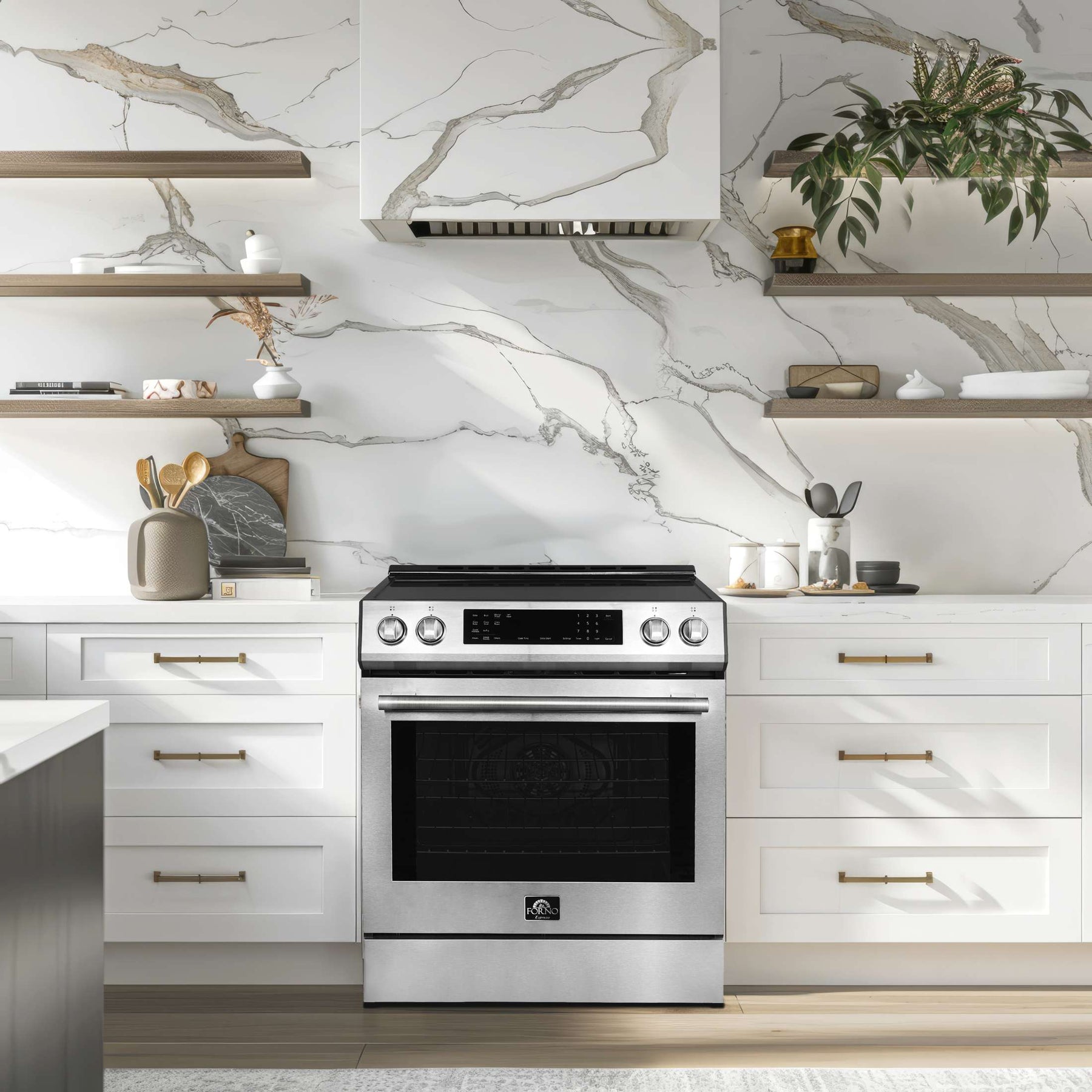 The Forno Donatello 30" features an intuitive digital display, offering effortless control over all cooking functions. The built-in air fry function eliminates the need for extra appliances, allowing you to create crispy, delicious meals while saving counter space. Experience superior performance with automatic convection conversion, which optimizes time and temperature for perfect results. The ceramic glass cooktop ensures even heat distribution and smooth cookware movement, while the stainless steel finish provides durability, heat resistance, and a sleek, easy-to-clean surface. The 5.0 cu. ft. true convection oven is powered by a 2,500-watt convection system and a 5,800-watt total broil and bake output, delivering consistent, professional-grade cooking. With two oven racks, you can bake, roast, and broil multiple dishes at once.