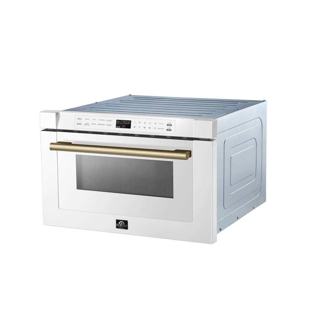 Upgrade your kitchen with the Forno Capolivera 24" Microwave Drawer, designed for effortless cooking. Featuring a 1.2 cu. ft. capacity, this white microwave with antique brass accents delivers 1,500 watts of power for fast, even heating—boiling water in just 1 minute and 50 seconds. With 11 power levels, you can precisely control cooking temperatures for everything from reheating to gourmet prep. Glass touch controls and an LED display offer a modern, user-friendly experience, while pre-programmed settings make it easy to melt butter, chocolate, and more. Enjoy versatile cooking modes, including defrost, popcorn, and beverage heating. The spacious interior accommodates 7-inch coffee mugs and 16 x 16-inch dishes, making it perfect for everyday use.
