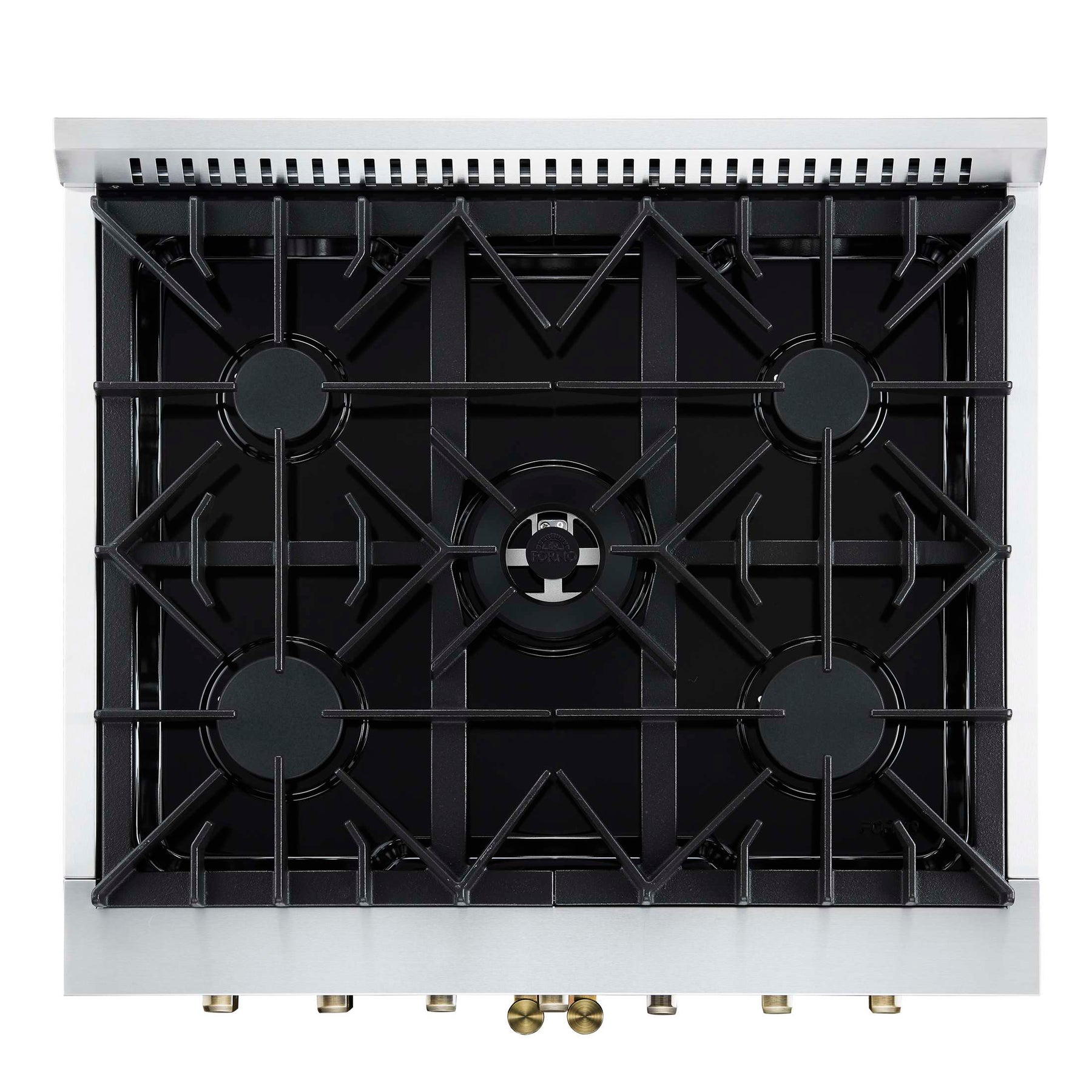 Our 30" Galiano Dual Fuel French Door Range blends timeless design and high performance. Featuring a crisp white finish and antique brass knobs, this range adds sophistication to any kitchen at an affordable price. The cooktop boasts five sealed burners with a total output of 68,000 BTU, including a 20,000 BTU dual-ring burner ideal for boiling, searing, or simmering delicate sauces. The heavy-duty cast iron grates provide a stable surface and allow you to slide cookware effortlessly across the cooktop. Its spacious 4.32 cu.ft. true convection oven delivers even heat distribution, powered by 6,300 watts, for perfectly baked and roasted dishes. Easy-to-clean black enamel interiors, French door convenience, and included electroplated racks make this range as practical as it is beautiful. Complete with an LP conversion kit and NEMA 14-50 power cord, the Galiano Range is built for both style and efficiency.