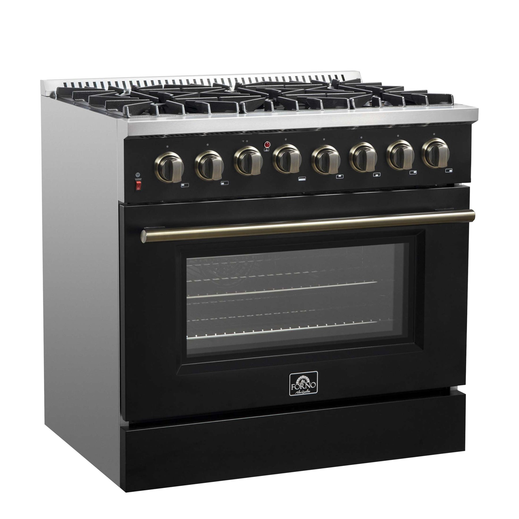 The Galiano 36" Dual Fuel Range blends professional style and performance in sleek black with antique brass accessories. Featuring six sealed burners with a total output of 83,000 BTU, including a powerful 20K dual-ring burner for boiling or searing, it gently simmers delicate foods, such as chocolate and sauces. The cast iron grates provide stability and smooth pan sliding, while the 5.26 cu. ft. electric oven delivers 6,300 watts of power, making it perfect for baking, roasting, and broiling with true convection options. Included are two oven racks, an LP conversion kit, and elegant zinc-coated metal knobs with bezel rings that retain their beauty.