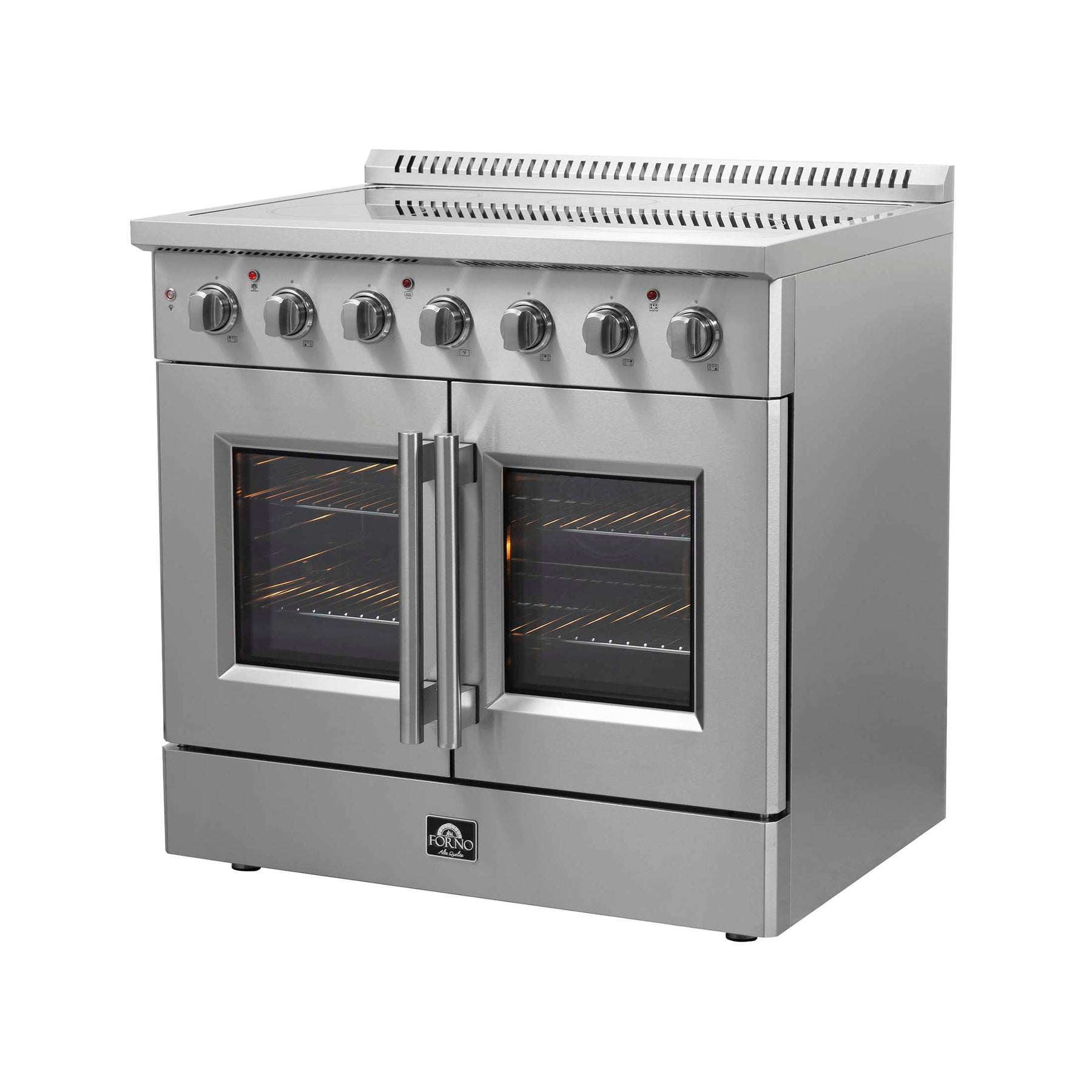 The Forno Galiano 36 Inch French Door Alta Qualita Pro-Style Freestanding Electric Range elevates your home kitchen with professional styling and enduring quality, featuring a robust stainless-steel design. The french door design will make your everyday cooking task easier allowing up to 12 Inch opening for an easy access of your oven. Boasting 5 radiant elements, the cooking surface delivers a total output of 7,700 watts. The 5.36 cu. ft. capacity oven enhances cooking flexibility with a combined broil and bake output of 4,800 watts, complemented by a 1,500 watts true convection fan for precision. This unit includes 2 chromed oven racks, an Air Fryer kit, and a 4-prong power cord (NEMA 14-50P), providing both versatility and convenience.