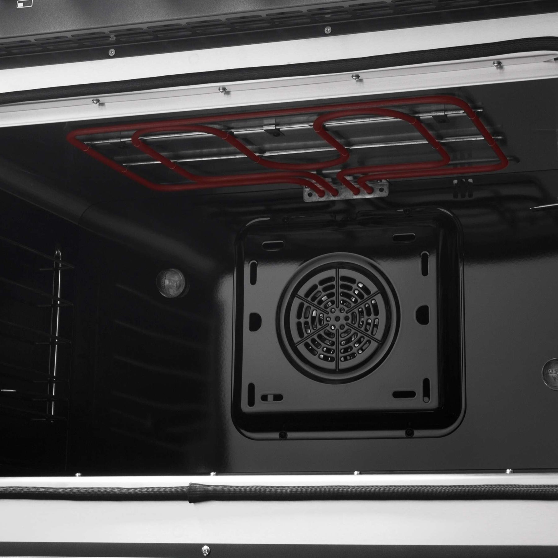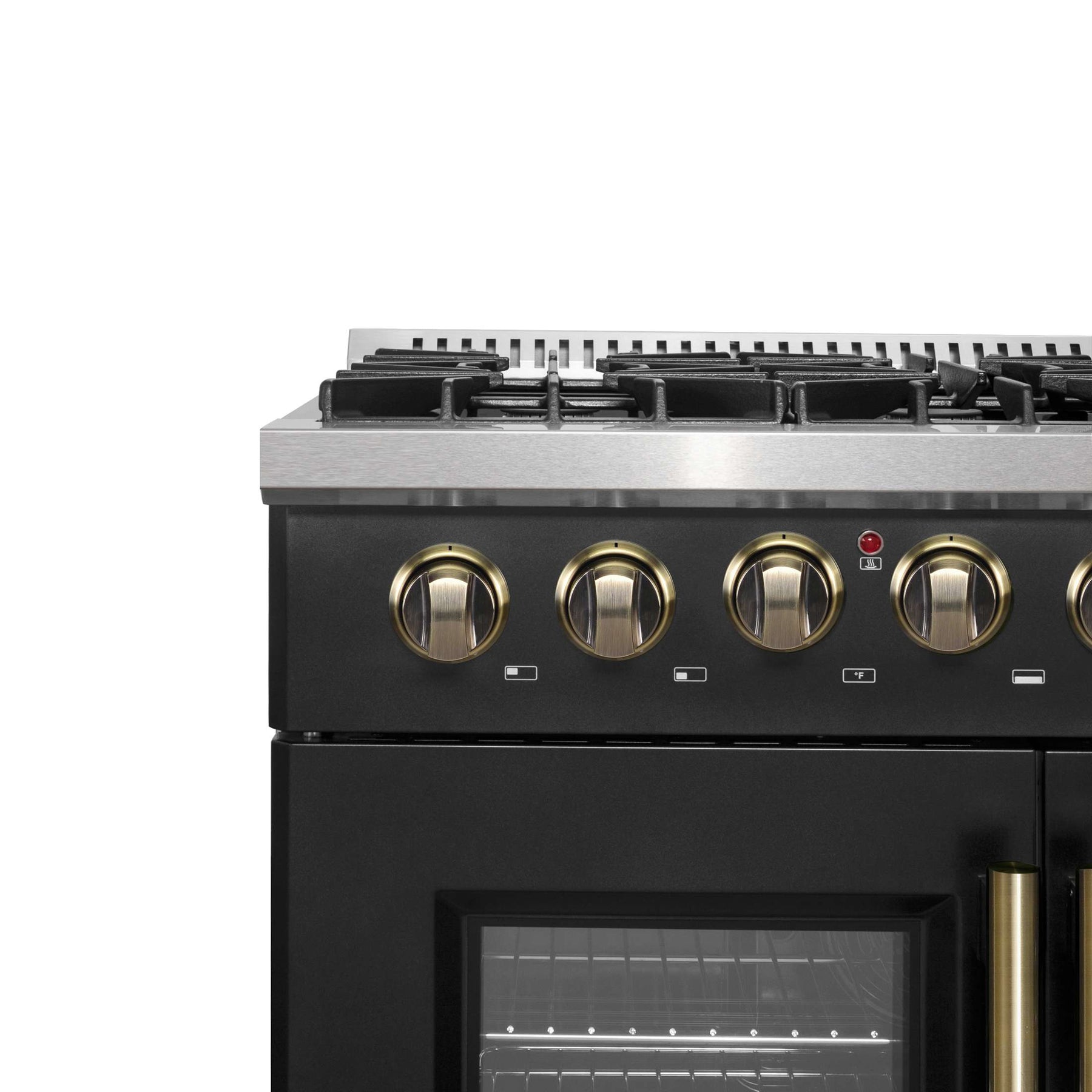 Our 36" Galiano Dual Fuel French Door Range blends timeless design and high performance. Featuring a sleek black finish and antique brass knobs, this range adds sophistication to any kitchen at an affordable price. The cooktop boasts six sealed burners with a total output of 83,000 BTU, including a 20,000 BTU dual-ring burner ideal for boiling, searing, or simmering delicate sauces. The heavy-duty cast iron grates provide a stable surface and allow you to slide cookware effortlessly across the cooktop. Its spacious 5.36 cu.ft. true convection oven delivers even heat distribution, powered by 6,300 watts, for perfectly baked and roasted dishes. Easy-to-clean black enamel interiors, French door convenience, and included electroplated racks make this range as practical as it is beautiful. Complete with an LP conversion kit and NEMA 14-50 power cord, the Galiano Range is built for both style and efficiency.