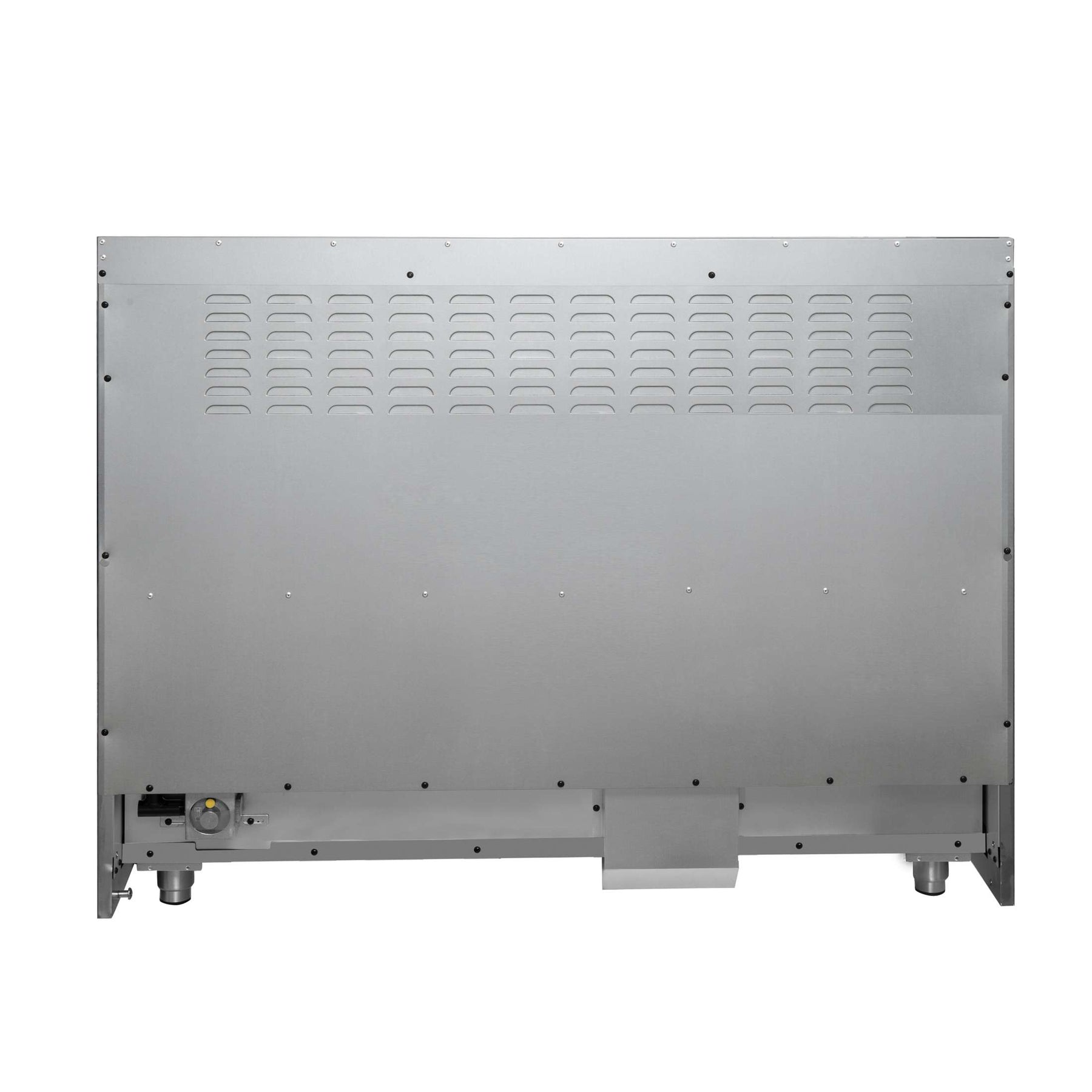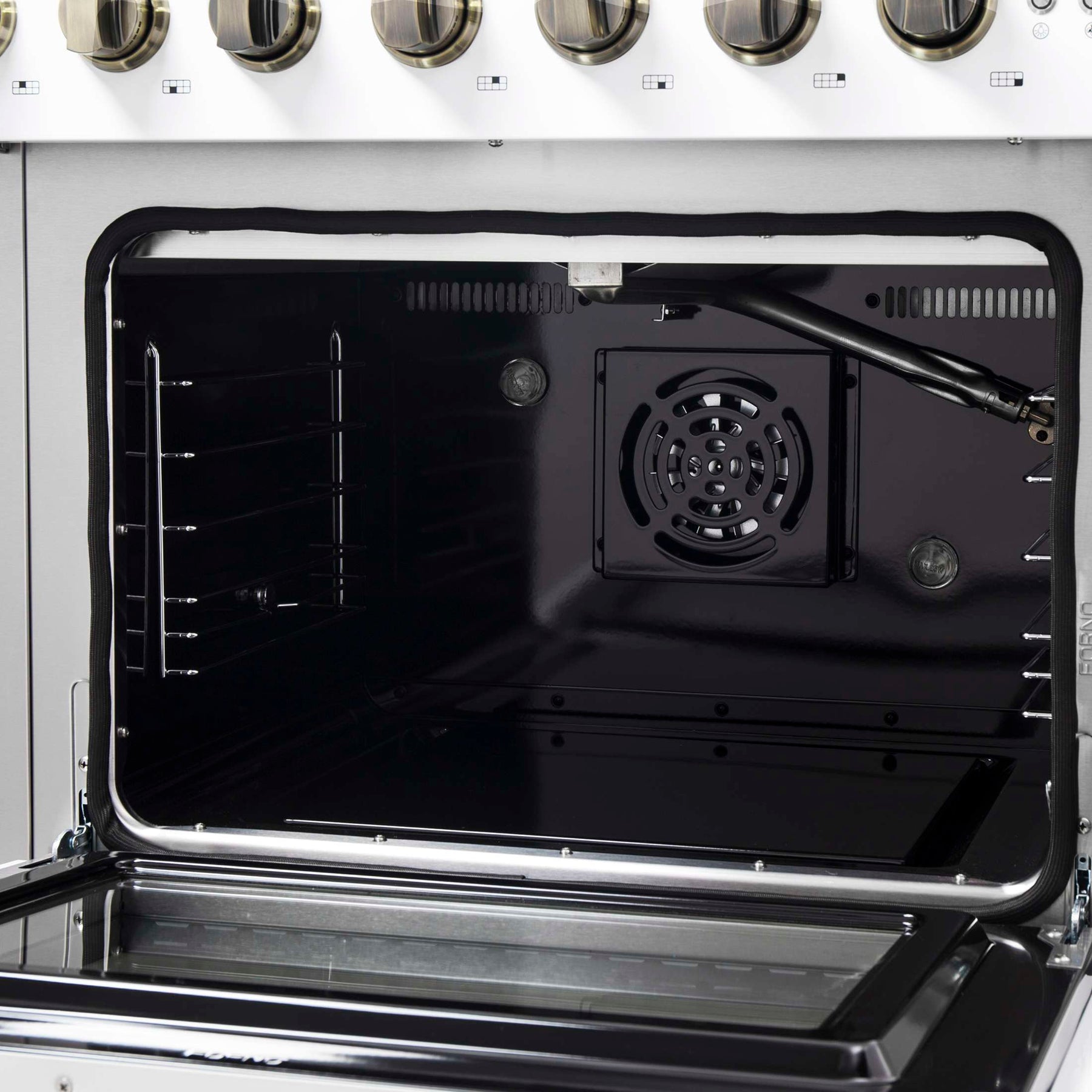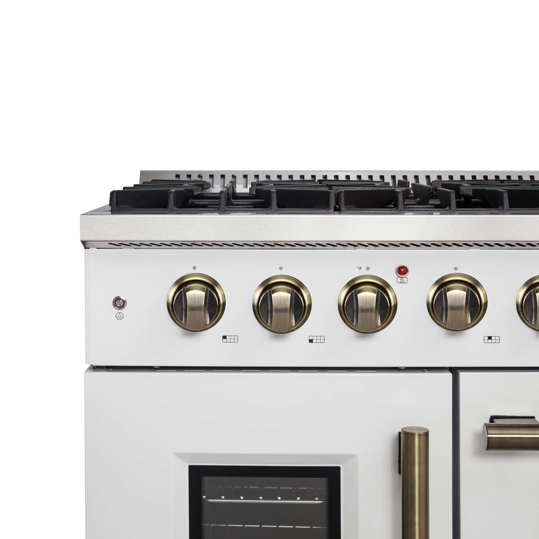 The Forno Galiano 48" French Door Gas Range in white brings professional styling and performance into your home kitchen at an affordable price. Enjoy effortless access to your oven with French doors that offer an extra 12 inches of space. The cooking surface has eight sealed burners with a total output of 107,000 BTU - one of which is a 20,000 BTU dual-ring burner that can reach a precise simmer of 1,000 BTU. Cast iron grates ensure stability over the cooktop, making spills easy to clean. This range features double gas ovens with a combined 6.58 cu. ft. capacity and 44,000 BTU, set in durable black enamel interiors for easy upkeep and clear visibility through a three-layer glass door. The 4.32 cu. ft. main oven includes a convection fan for efficient, multi-level cooking. Zinc-coated metal knobs with bezel rings are built to stay beautiful for years, adding a touch of lasting elegance to your kitchen. Four electroplated oven racks and an LP conversion kit are included.