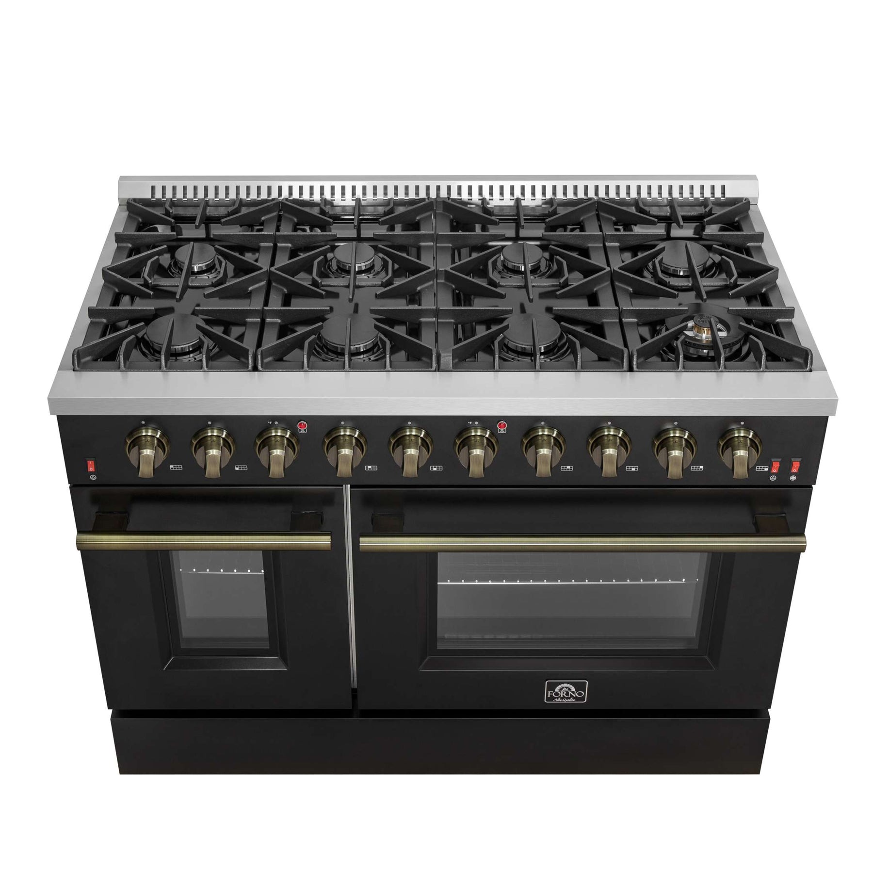 The Forno Galiano 48" Gas Range in black with antique brass accessories combines professional-grade performance with durability. The cooktop features 8 sealed burners with a total output of 107,000 BTU, including a 20,000 BTU dual-ring burner that can simmer at 1,000 BTU. Our cast iron grates ensure cookware stability and effortless movement between burners. The main convection oven offers 4.32 cu. ft. and delivers a total of 30,000 BTU for broiling and baking, while the secondary oven has a capacity of 2.26 cu. ft. with a 14,00 BTU for baking. Both ovens feature a sleek black enamel interior and a three-layer tempered glass door for superior heat retention and clear visibility. Additional features include 2 oven racks, an LP conversion kit, and durable zinc-coated knobs with bezel rings, built to maintain their beauty. Backed by Forno's 2-year warranty, this range offers peace of mind, lasting performance, and exceptional affordability.