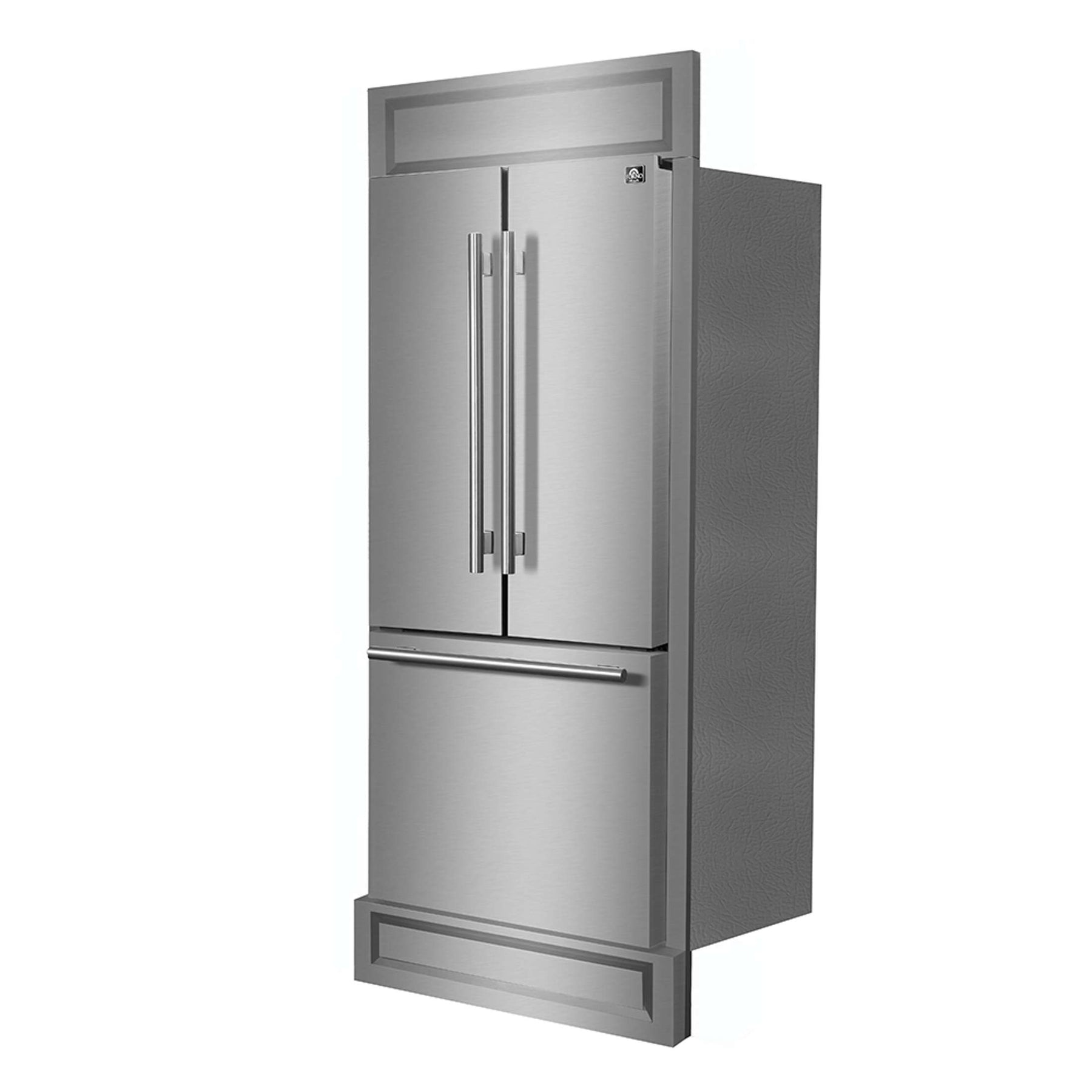The Forno Gallipoli 30" Stainless Steel French Door Refrigerator offers a perfect blend of style, efficiency, and modern cooling technology. Its 17.5 cu. ft. capacity includes 12.4 cu. ft. of fresh food storage with adjustable glass shelves, crisper drawers, and spacious door bins, while the 5.1 cu. ft. freezer features a pull-out drawer, dual storage bins, and an automatic ice maker producing up to 4 lbs. of ice daily. A high-efficiency inverter compressor ensures quiet operation and precise temperature control, while the LED touch panel allows effortless adjustments. ENERGY STAR Certified for optimal performance, this refrigerator also features bright LED lighting to reduce spoilage. Finished with antique brass handles and a modern decorative grill, it adds a sophisticated touch to any kitchen.