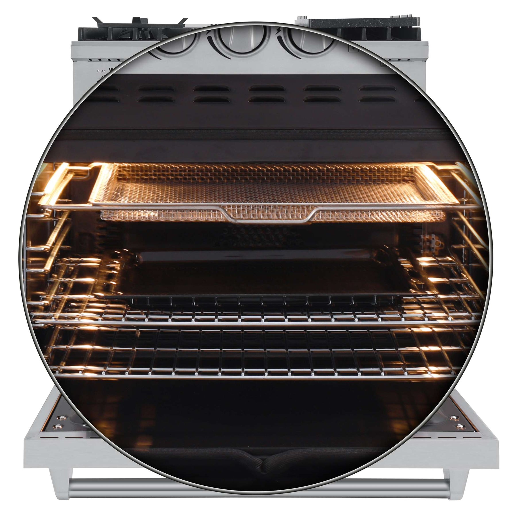 The Lazio 30 Inch Alta Qualita Dual Fuel Range blends professional design with durability. Its stainless-steel structure boasts 5 sealed burners (70,000 BTU total), including a potent dual-ring burner for boiling or searing and precise simmering. The continuous cast iron grates, wok ring, and reversible grill/griddle enhance cooking versatility. The 4.32 cu. ft. oven, with 6500 Watt combined convection broil and bake output, features an insulated 3-layer glass door for safety and visibility. The true convection element ensures fast, precise, and consistent cooking. Accessories include 2 oven racks, air fry rack & basket, drip pan (suitable for steam cleaning), and an LP conversion kit. Zinc-coated metal knobs with bezel rings ensure enduring beauty.