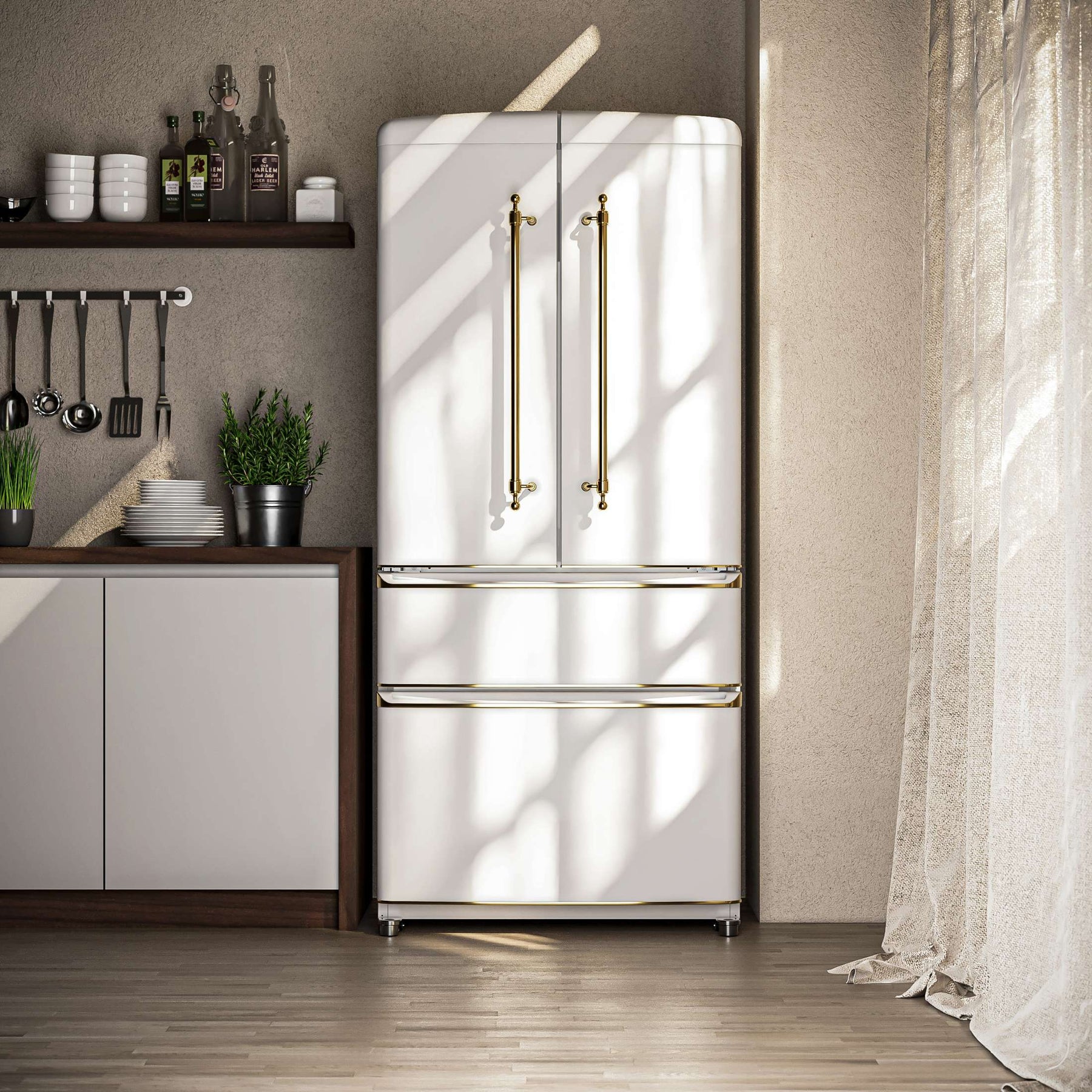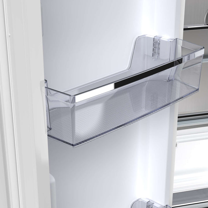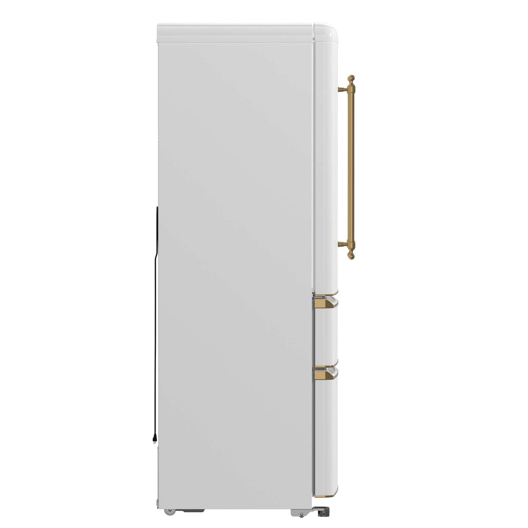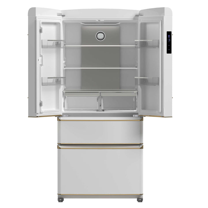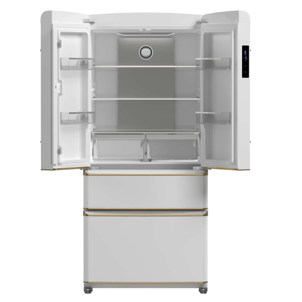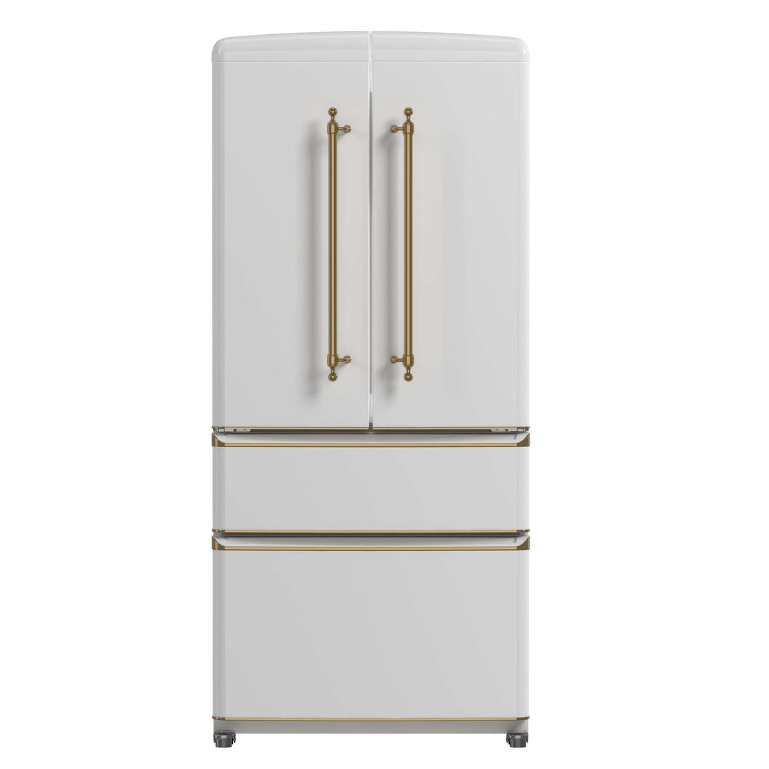 Upgrade your kitchen with our 18 cu.ft. frost-free refrigerator featuring a stylish white finish complemented by antique brass handles. Enjoy ample storage with 12 cu.ft. of fresh food space and a 6 cu.ft. freezer, equipped with adjustable glass shelves, spacious door bins, and crispers for organized storage. The Super Cool and Super Freeze functions help lock in freshness, while bright LED lighting ensures easy visibility. With no-frost technology, hassle-free maintenance is a given. A sleek retro-inspired design, combined with a durable stainless steel back panel and silver-trimmed details, makes this ENERGY STAR-certified refrigerator a perfect blend of style, functionality, and energy efficiency. Lower the cost of living with Forno.