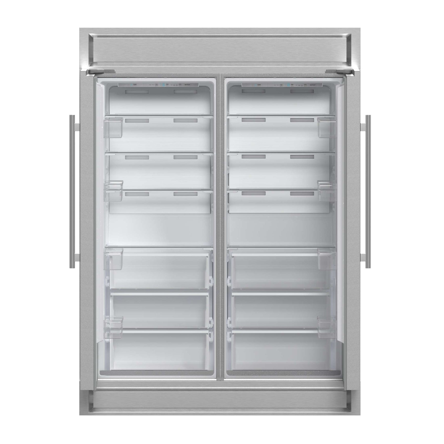 The Forno Maderno combines two 28 Inch refrigerators with decorative trim grill, extending to a 60 Inch width for a built-in appearance, harmoniously blending style with convenience. This combo offers ample storage space totaling 27.2 cu.ft. They feature customizable cooling with convertible function and total no frost technology, eliminating tedious defrosting. The side-by-side door design integrates seamlessly, while elegant glass shelves with silver trim and practical plastic door balconies enhance appeal and storage. Effortlessly switch between Fahrenheit and Celsius, aided by LED lighting for easy item location. Six glass shelves and six plastic drawers with silver trim provide flexible storage, and temperature settings are easily managed with the electronic touch control panel. The VCM door panel and metal back ensure durability, and the combo is T Climate Class certified with an E-star energy rating for sustainability.