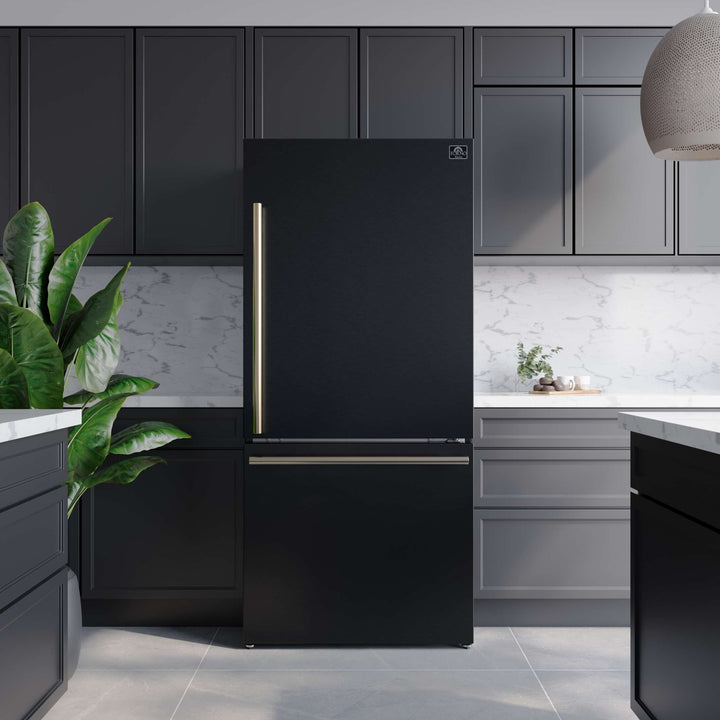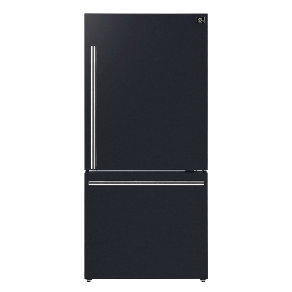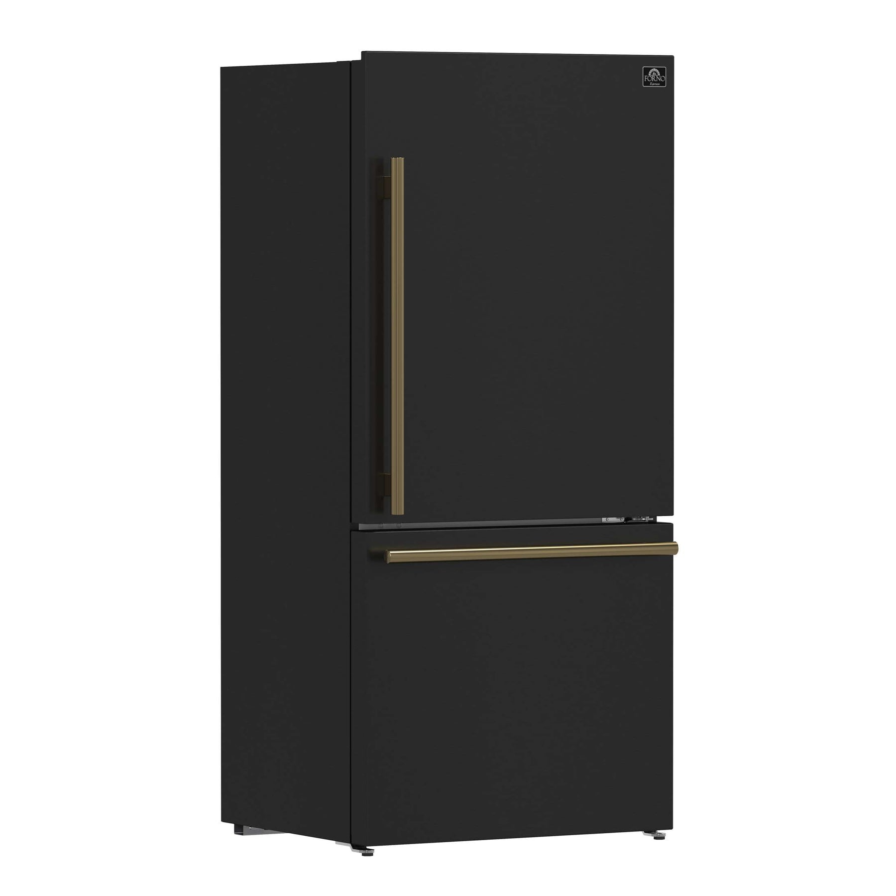 Introducing the FORNO 31 Inch Milano Espresso Bottom Freezer Refrigerator that seamlessly blends style and functionality. Its compact 31 Inch size and 17.2 cu ft capacity offer ample storage without compromising aesthetics. Two full-width freezer drawers optimize organization, while digital touch control ensures precise temperature settings and real-time monitoring. The black finish door maintains a modern look effortlessly. Swift temperature adjustment with Super Cool and Super Freeze safeguards your groceries quality. ENERGY STAR Certified for efficiency, and high-efficiency LED lighting reduces food spoilage. Antique brass handles add an elegant touch, and adjustable features, including shelves, door bins, and a full-width crisper drawer, enhance user-friendliness. Upgrade your kitchen with style, convenience, and freshness!