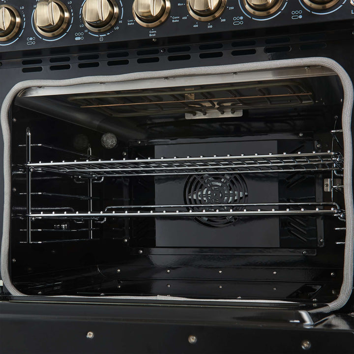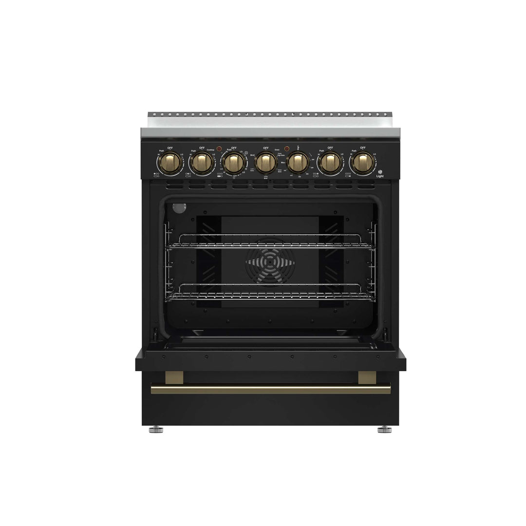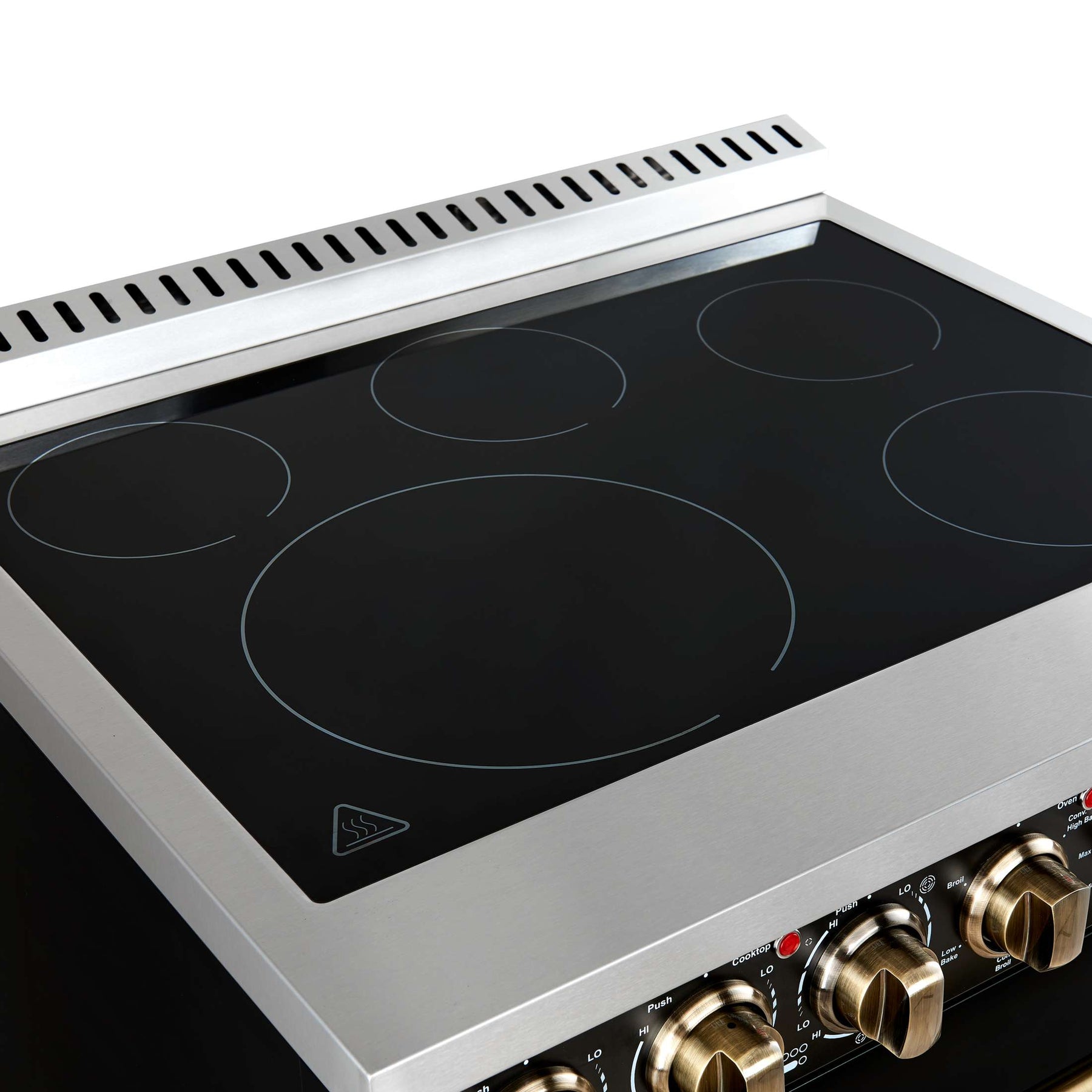 The Forno Paolo 30" Freestanding Electric Range in black delivers powerful performance and modern style. Its smooth ceramic glass cooktop evenly distributes heat across five radiant elements with a total output of 7,800 watts. The 4.38 cu. ft. true convection oven, powered by a 1,200-watt convection fan and a 3,800-watt bake and broil system, ensures faster, more consistent cooking. A hidden bake element simplifies maintenance, while bright halogen lighting and a large viewing window let you monitor dishes without releasing heat. Designed for versatility, this range also includes a 100-watt warming zone and a dual-element broiler for precise, high-heat cooking.