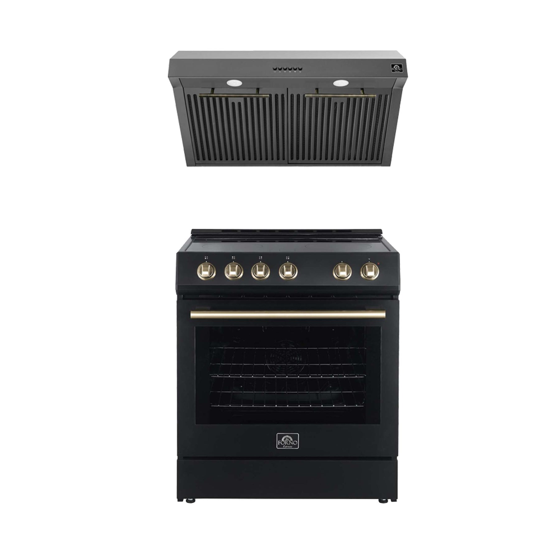 Upgrade your kitchen with the FORNO Premium 2-Piece Kitchen Bundle. This bundle includes the Leonardo Espresso 30" Black Electric Range and the 30" Black Under Cabinet Range Hood. Each appliance features a sleek black finish, combining elegance and high performance.