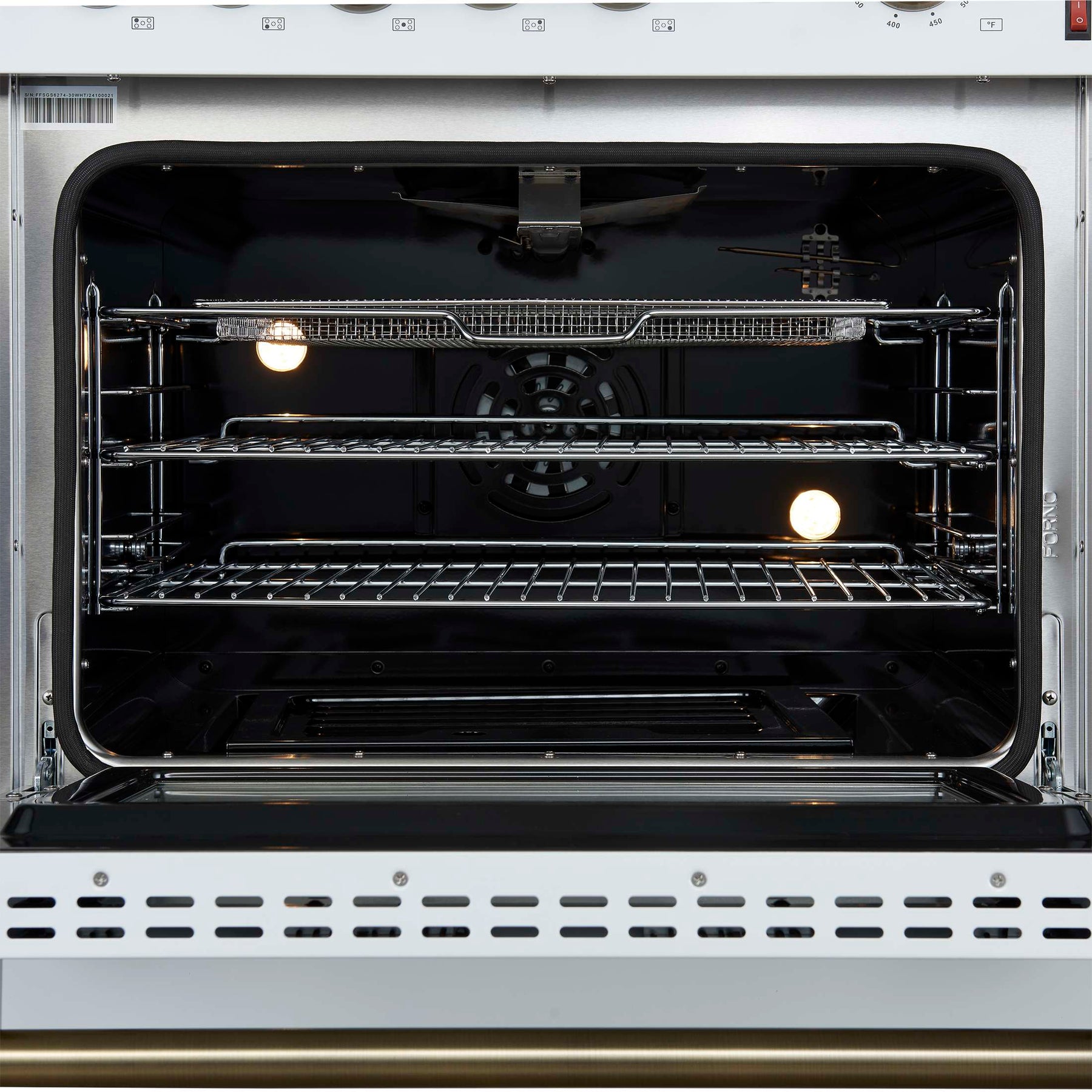 Elevate your cooking experience with the Giovanni 30" Alta Qualita Gas Range. Perfect for passionate home chefs, this range features five sealed burners delivering 67,000 BTU of power, including a dual-ring burner ideal for both intense searing and delicate simmering. The spacious 4.32 cu. ft. convection oven ensures even cooking, whether you're baking a family favorite or roasting a holiday meal. Accessories such as the air fryer basket and reversible griddle offer unmatched versatility, while the elegant white design adds a professional touch to your kitchen. Zinc-coated metal knobs with bezel rings are built to stay beautiful for years, adding a touch of lasting elegance to your kitchen.