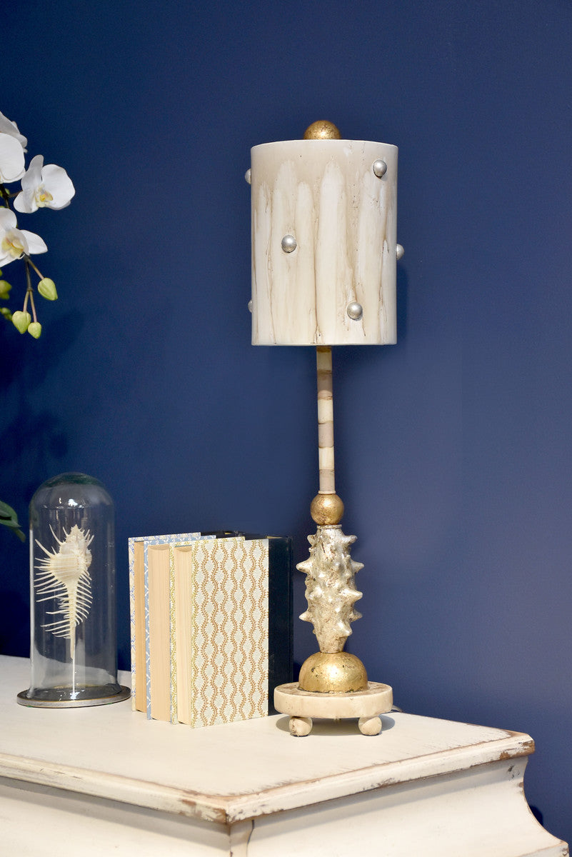 Stripes along the stem, and the mix of Gold and Silver hand painted resin, with a heavy glazed shade adds a whimsical look to THAT space. We love to see this in a playroom, updated remodeled Dining area or added into any design plan.