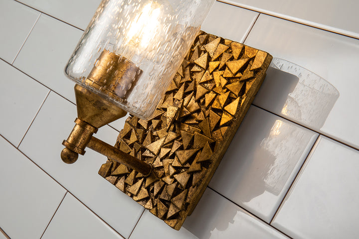 Pieces of our Mosaic Collection where used to create this charming design featuring a rectangle antique gold backplate, a curved arm, and clear seeded glass. It makes an unique statement with its elegant style and dramatic art-inspired design. Complete with a rectangle backplate that attaches it securely to the wall blending with all of the surrounding decor. This sconce creates a vintage-like, industrial expression combining antique gold with texture and shape, allowing our rustic wall light to be flexible enough to work in a bathroom, retail space, or home office. Includes all mounting hardware for quick and easy installation, and is carefully packed for easy shipment.