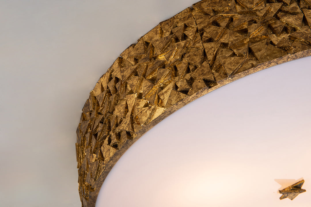This eye-catching centerpiece uses pieces of our Mosaic collection for inspiration, giving this 4 light flush mounted ceiling light a very charming and finished look. Using the 20 inch round shape for a touch of modern, this antique gold flush mount fixture has the best of both a traditional and contempory design. Using a diffused white glass to give off a crisp and flattering light, making this ceiling fixture a great look to finish a bedroom, closet, or living room.
