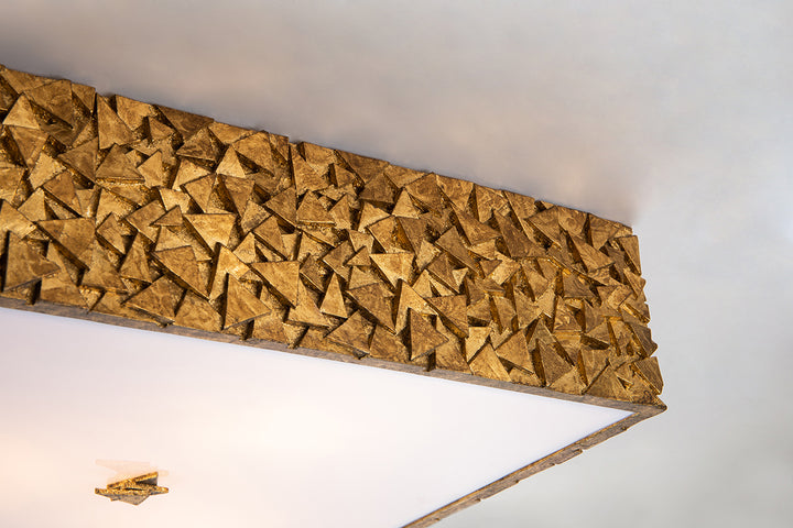 The unique and versatile square Mosaic flush mount, in a rich antique gold finish features a single piece of white glass and unique gold mosaic pieces showing our attention to detail. Using the 16 inch square shape for a touch of modern, this antique gold fixture can blend in traditional and contempory settings working great in bedrooms, closets and other living spaces.