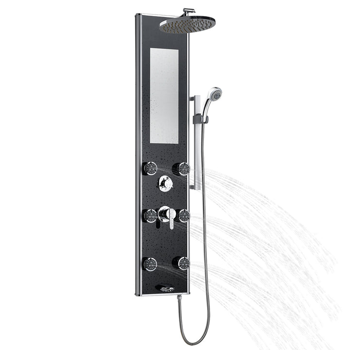 Our Leilani ShowerSpa boldly transforms the ordinary shower into a luxurious shower system! This complete unit has a sleek anodized aluminum edge, black Tough Glass panel, integrated mirror, and slide bar that make it both stylish and durable. Featuring an 8" rain showerhead, adjustable height brass shower arm, six dual-function body jets, a multi-function handshower and tub spout. Enjoy fingertip control of the four functions via the built-in brass diverter and get reliable performance with the PULSE Tru-Temp™ pressure balance valve. Upgrade the performance and aesthetics of your shower today with a PULSE Leilani ShowerSpa.