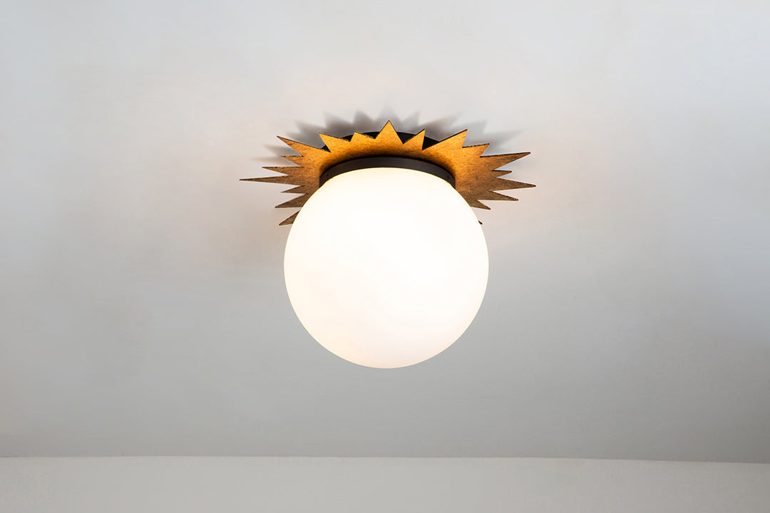 Looking to lighten up your space with a whimsical and art-inspired piece made in antique gold? Designed using a statement-making sun shape , this three-light flush mount is the favorite pick for installing in the bathroom, kitchen or closet. Creating an eye-catching focal point, this 3 light star shaped ceiling light is unique enough to work in the most sophisticated spaces, and using the mixed metal finishes, will give texture and depth, and add a little more drama to your bathroom, hallway or favorite reading nook. Measuring with a 15" diameter, the Soleil flush mount is finished in weathered gold, and can easily fit in any of your favorite spaces.