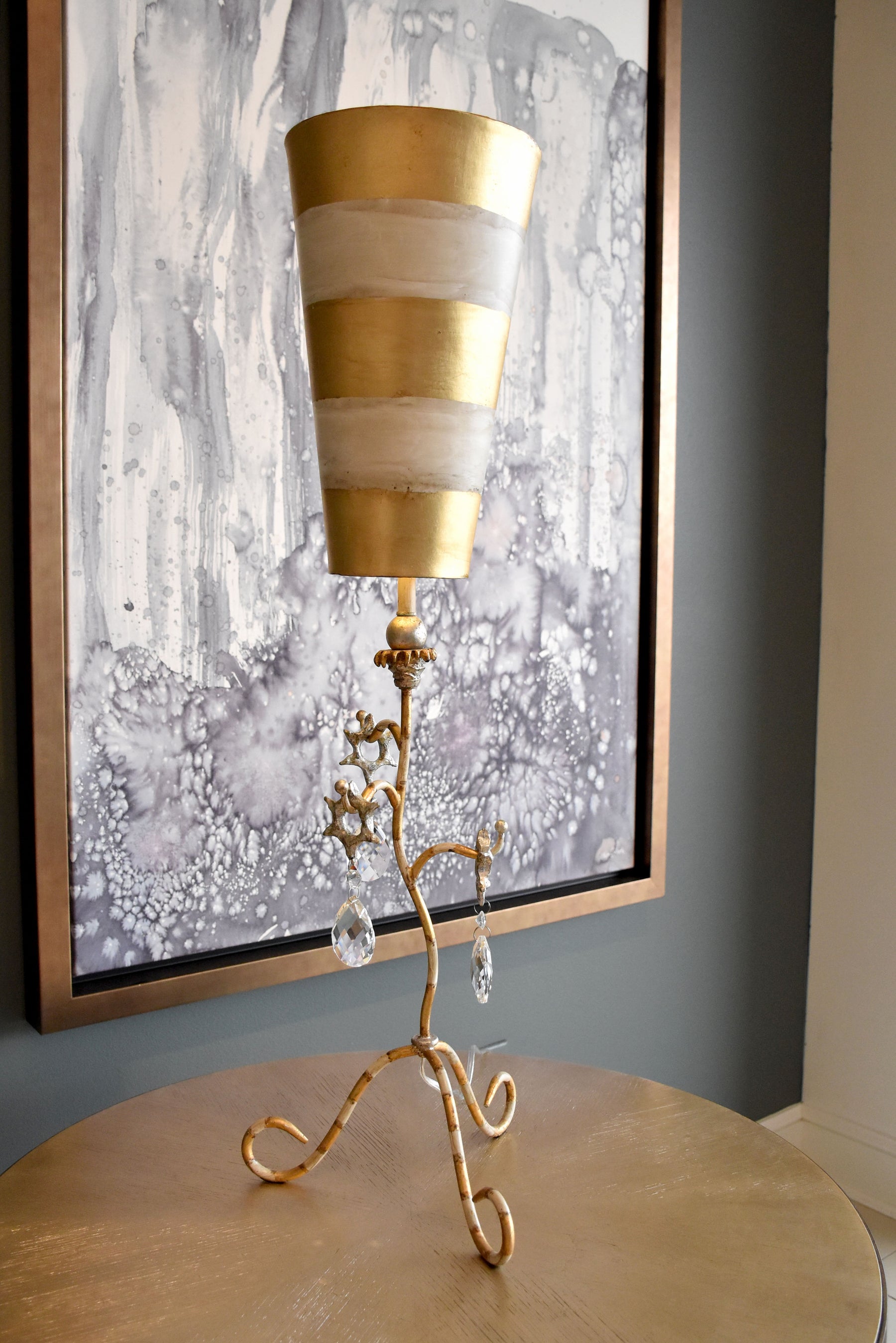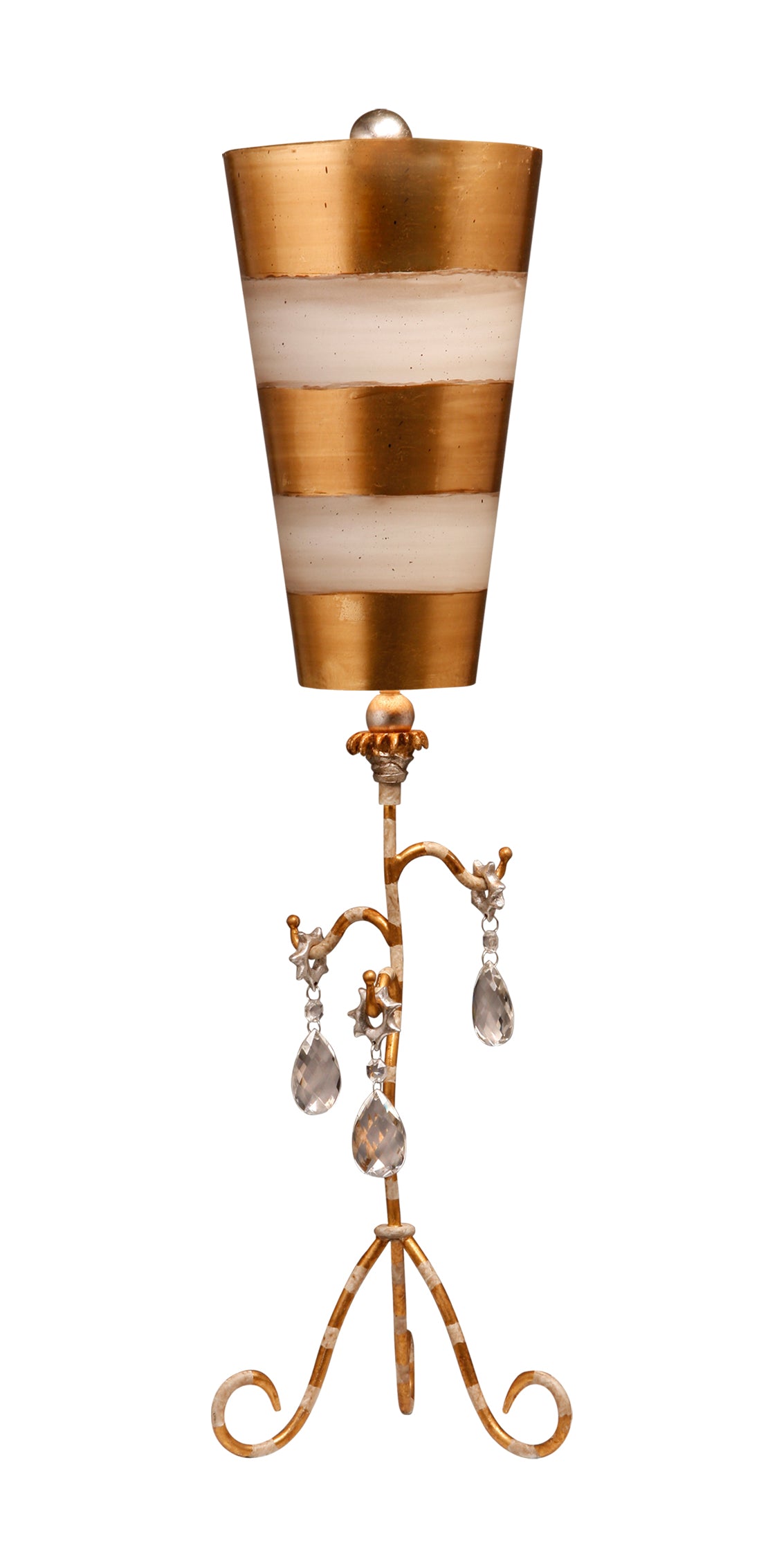 - Teardrop shapes of cut glass reflect from gold leaf & cream striped stem; inverted gold and cream striped shade, topped with gilded ball finial.