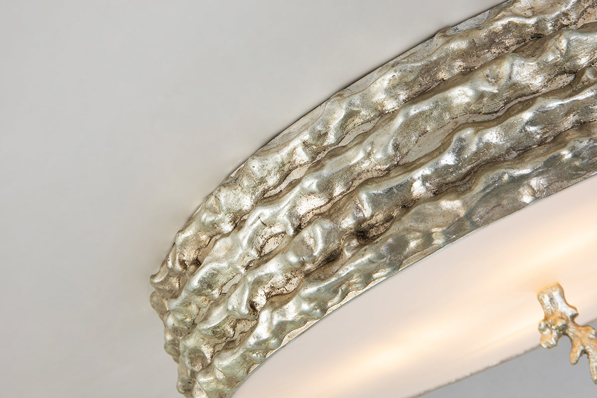 Light up any space in glamorous style with this 20 inch round antique silver flush mount. This sophisticated 4 light ceiling fixture, features a cylindrical hand painted frame that uses texture to create the decorated pattern that is used in our trellis collection. Complete with a frosted glass diffusor to spread the light evenly around the space, and a beautifully sculpted finial to add that finishing touch.