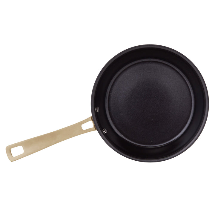 Sleek Black Ceramic Frying Pans. Ceramic frying pans feature Champagne Bronze handles and a sleek black finish that minimizes staining