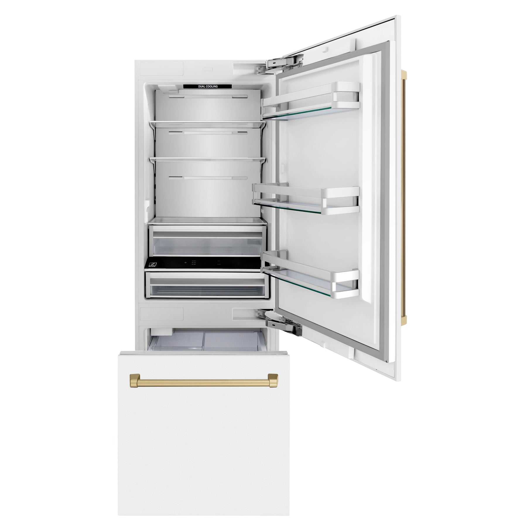 Enhance your kitchen with the ZLINE Autograph 30" 16.1 cu. ft. Built-In 2-Door Bottom Freezer Refrigerator. This refrigerator combines high-quality performance with classic design, offering advanced capabilities such as adjustable temperatures, RapidChill Mode, and a concealed internal water and ice dispenser. Experience ZLINE's Attainable Luxury with this refrigerator, seamlessly blending innovation, elegance, and efficiency.