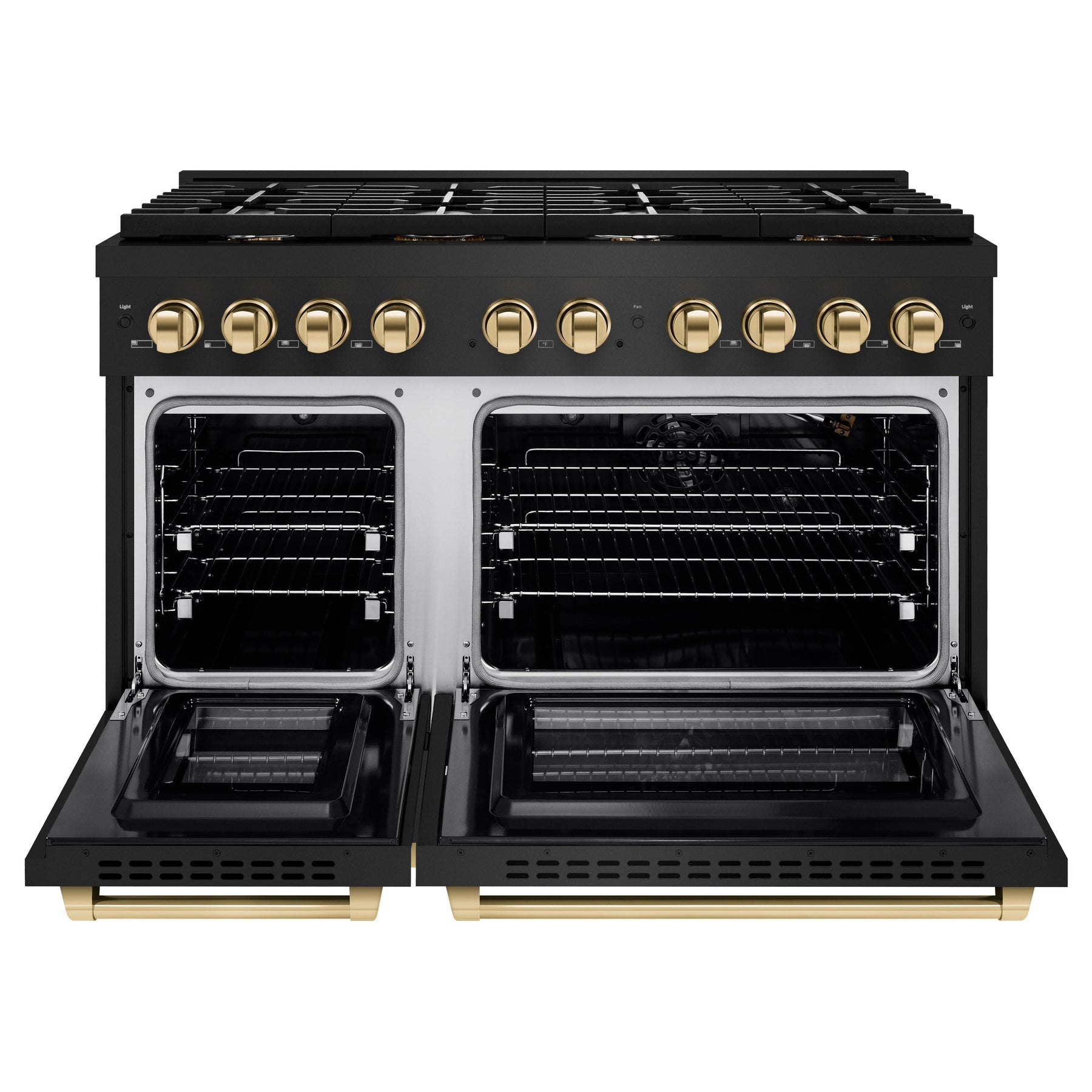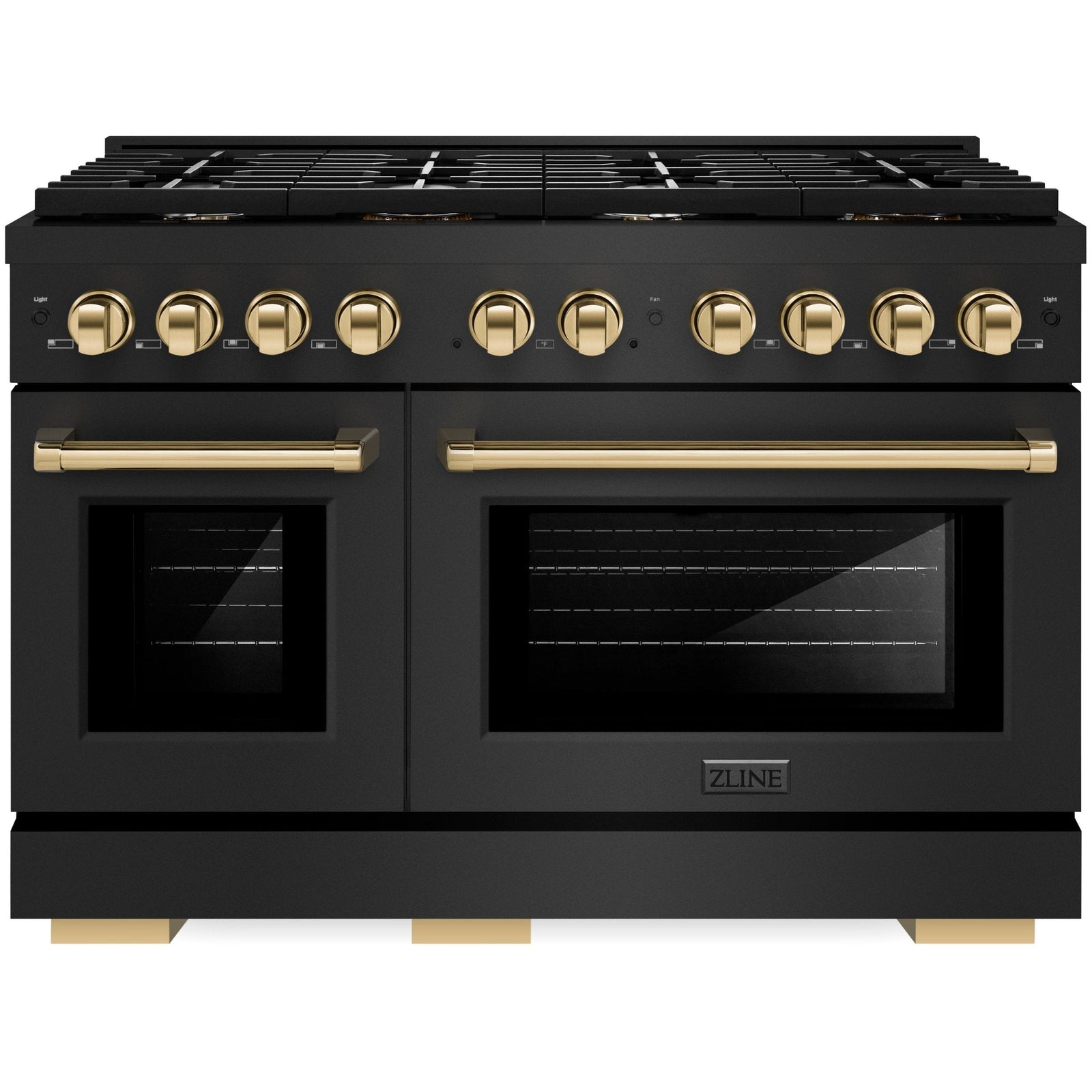 The ZLINE Autograph Paramount Edition 48" Gas Range offers professional cooking with a gas stove and convection gas oven. Designed in Lake Tahoe, USA, it features elegant finishes and personalized touches. The Paramount Edition Series is a luxurious choice with high-quality materials and innovative features. Experience gas cooking, Italian-made sealed brass burners, and a spacious oven.