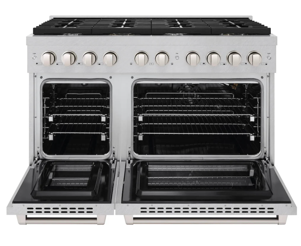The 48 inch 6.7 cubic-foot ZLINE Professional Gas Range in DuraSnow® Stainless Steel (SGRS-48) boasts a state-of-the-art gas cooktop with 8 Italian-made burners, a spacious and high-performing gas convection oven, and a compact baking oven, making it the perfect tool for mastering all your meals. Crafted with a sleek and timeless design, these Professional Gas Ranges provide exceptional functionality for an elevated cooking experience.