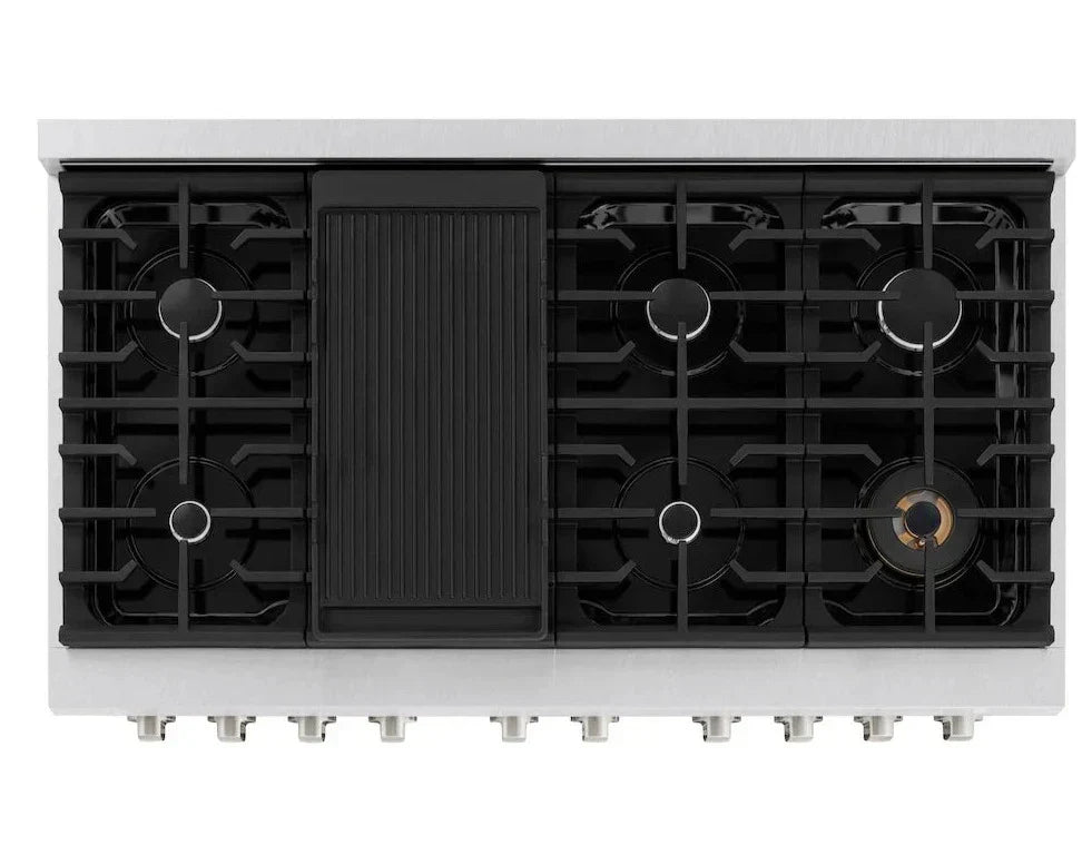 - Fingerprint Resistant Stainless Finish - Experience true professional quality with our ZLINE 48” Professional Gas Range, featuring exclusive DuraSnow® Stainless Steel that repels fingerprints and durable cast iron grates that meet high industry standards