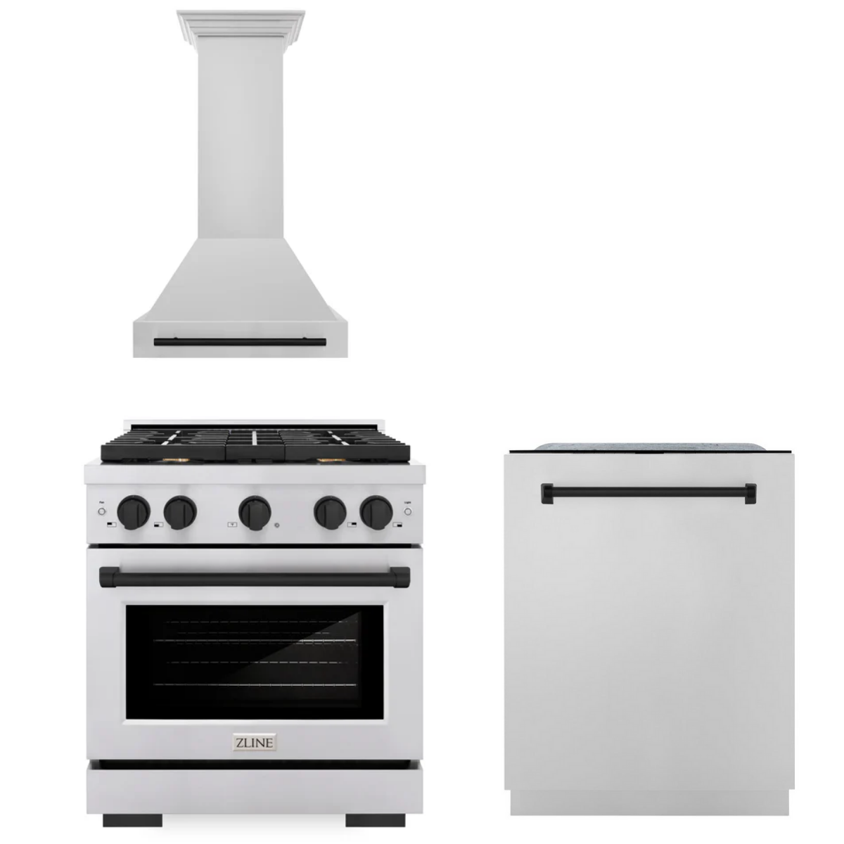 This ZLINE kitchen appliance package has a powerful 30 Inch Gas Range, Range Hood, and Dishwasher - all in Stainless Steel with Matte Black Accents.