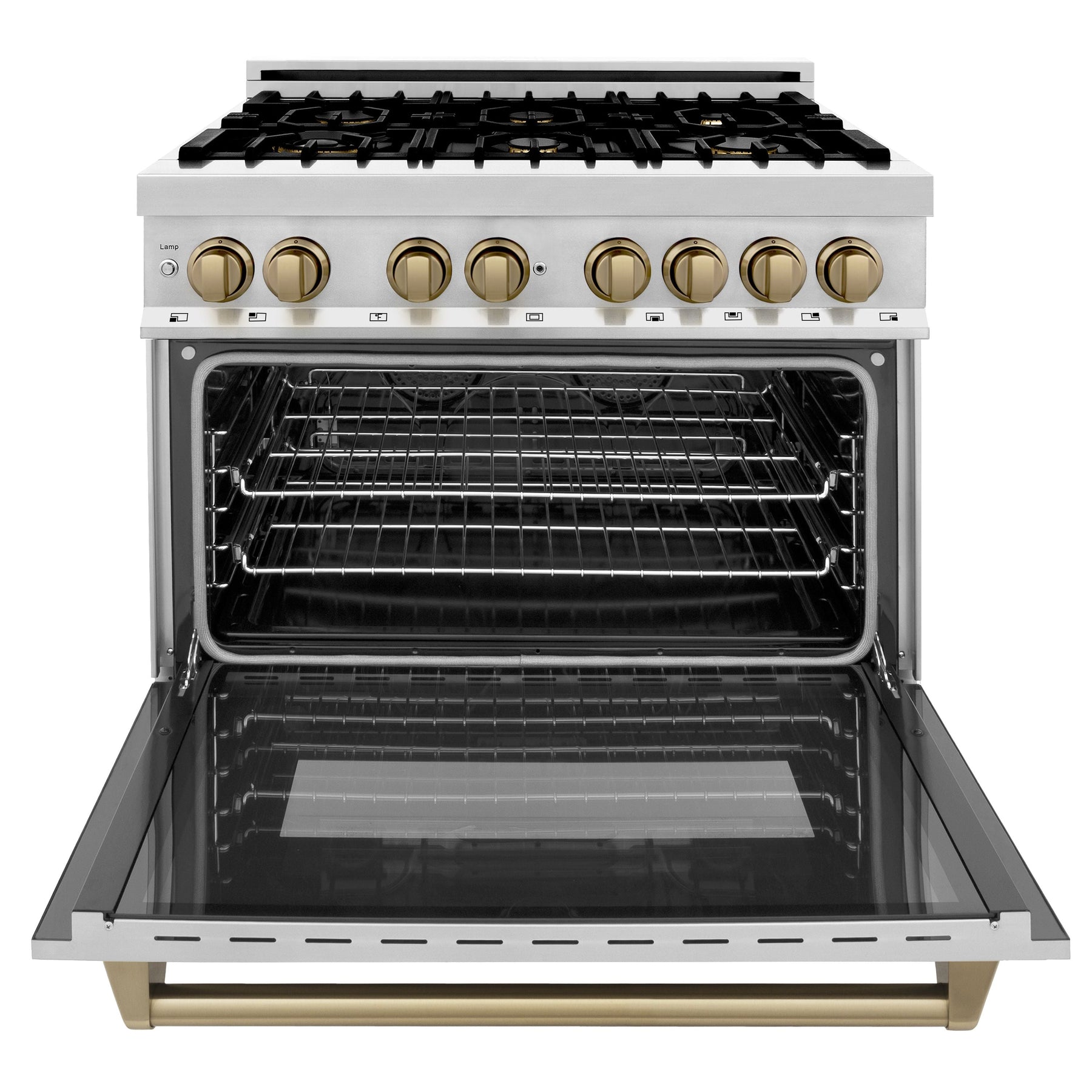 - ZLINE Autograph Edition 36 In. 4.6 cu. ft. Range with Gas Stove and Electric Oven in Stainless Steel with Champagne Bronze Accent, RAZ-36-CB