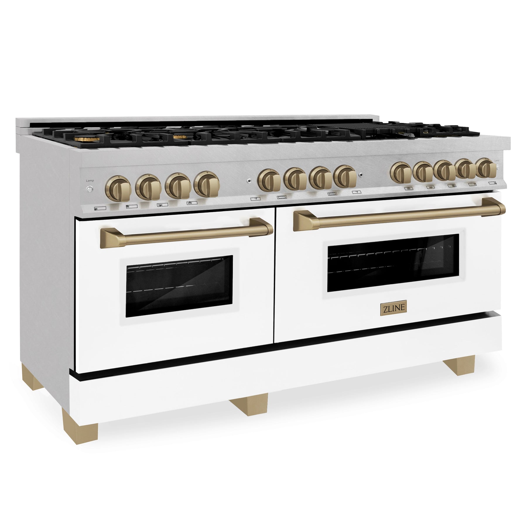 - Create a custom kitchen with easy installation - this Autograph Edition range is pre-assembled and shipped out complete with a white matte oven door, brass burners, and champagne bronze knobs, handles, and legs.