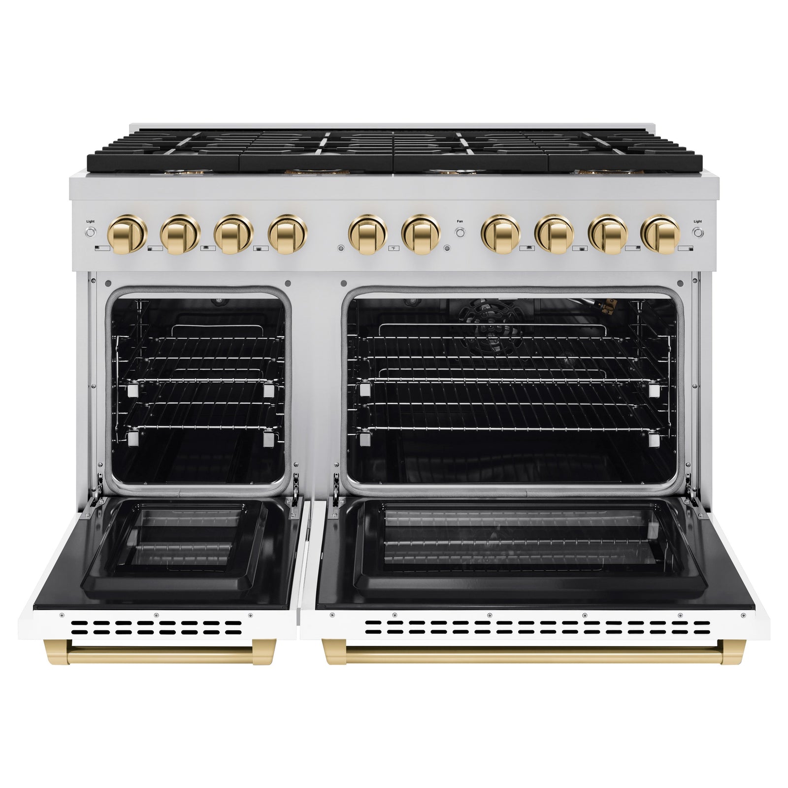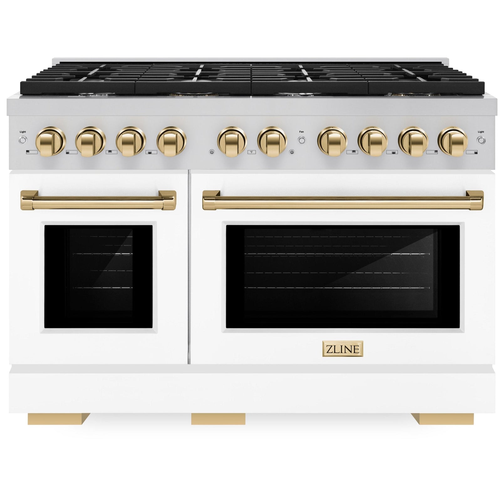 The ZLINE Autograph Paramount Edition 48" Gas Range offers professional cooking with a gas stove and convection gas oven. Designed in Lake Tahoe, USA, it features elegant finishes and personalized touches. The Paramount Edition Series is a luxurious choice with high-quality materials and innovative features. Experience gas cooking, Italian-made sealed brass burners, and a spacious oven.
