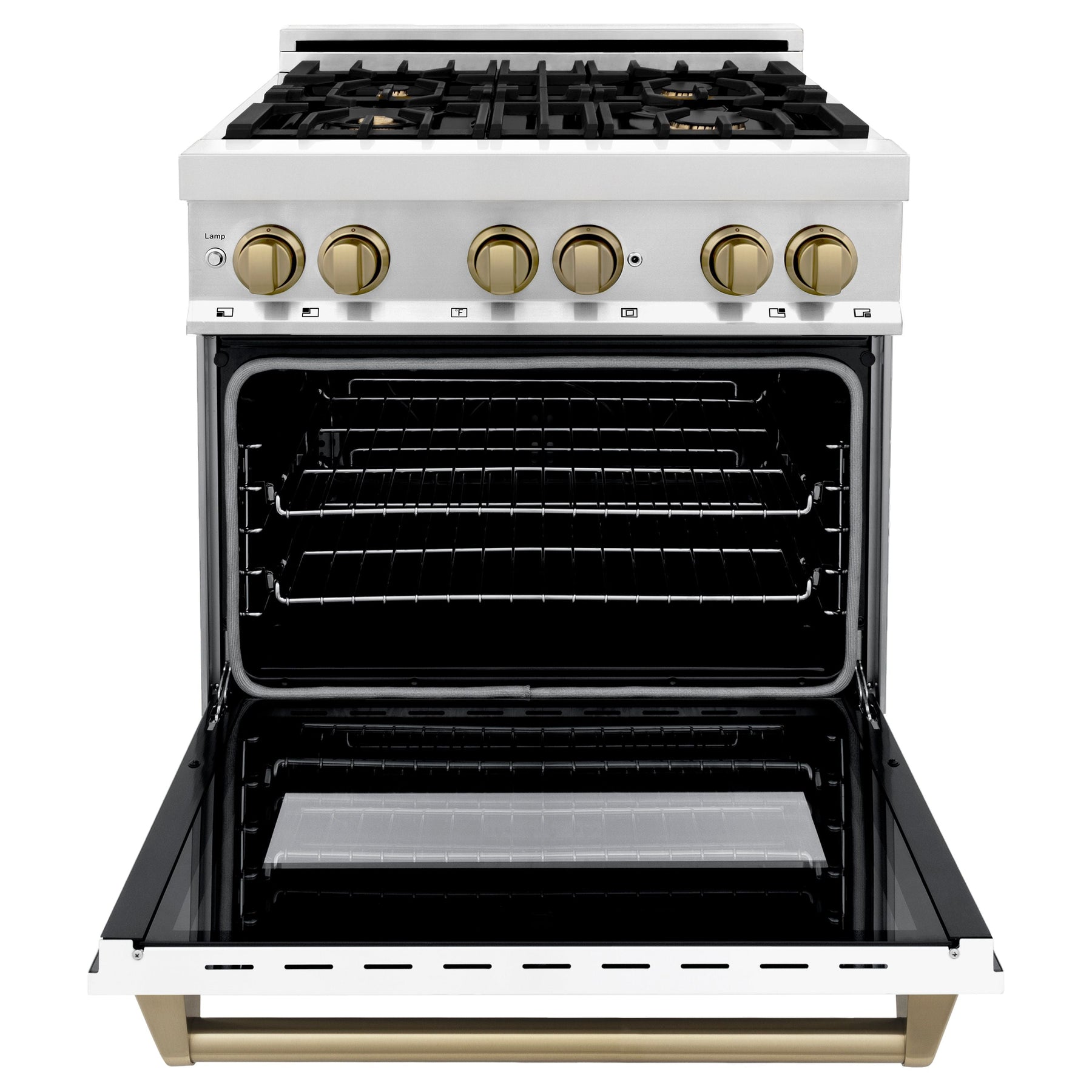 This ZLINE Kitchen Autograph Appliance Package has a powerful stainless steel 30" Dual Fuel Range and 30" Range Hood - all with eye-popping Champagne Bronze Accents!