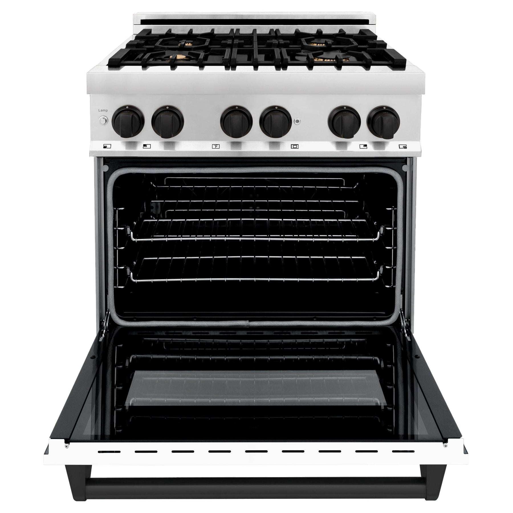 This ZLINE Kitchen Autograph Appliance Package has a powerful stainless steel 30" Dual Fuel Range and 30" Range Hood - all with eye-popping Matte Black Accents!