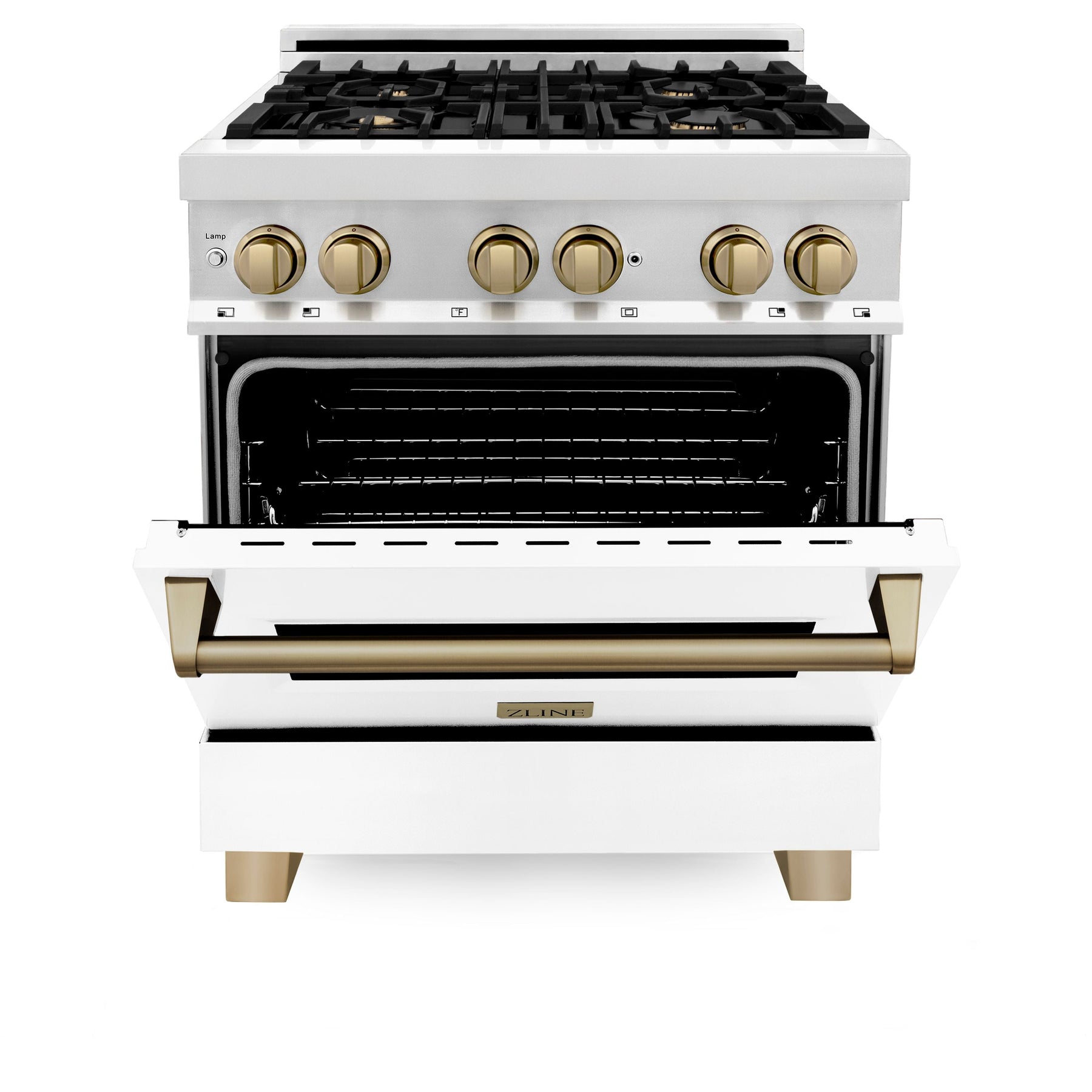 - ZLINE Autograph Edition 30 Inch Dual Fuel Range with Gas Stove and Electric Oven in Stainless Steel with White Matte Door, Champagne Bronze Accents, RAZ-WM-30-CB