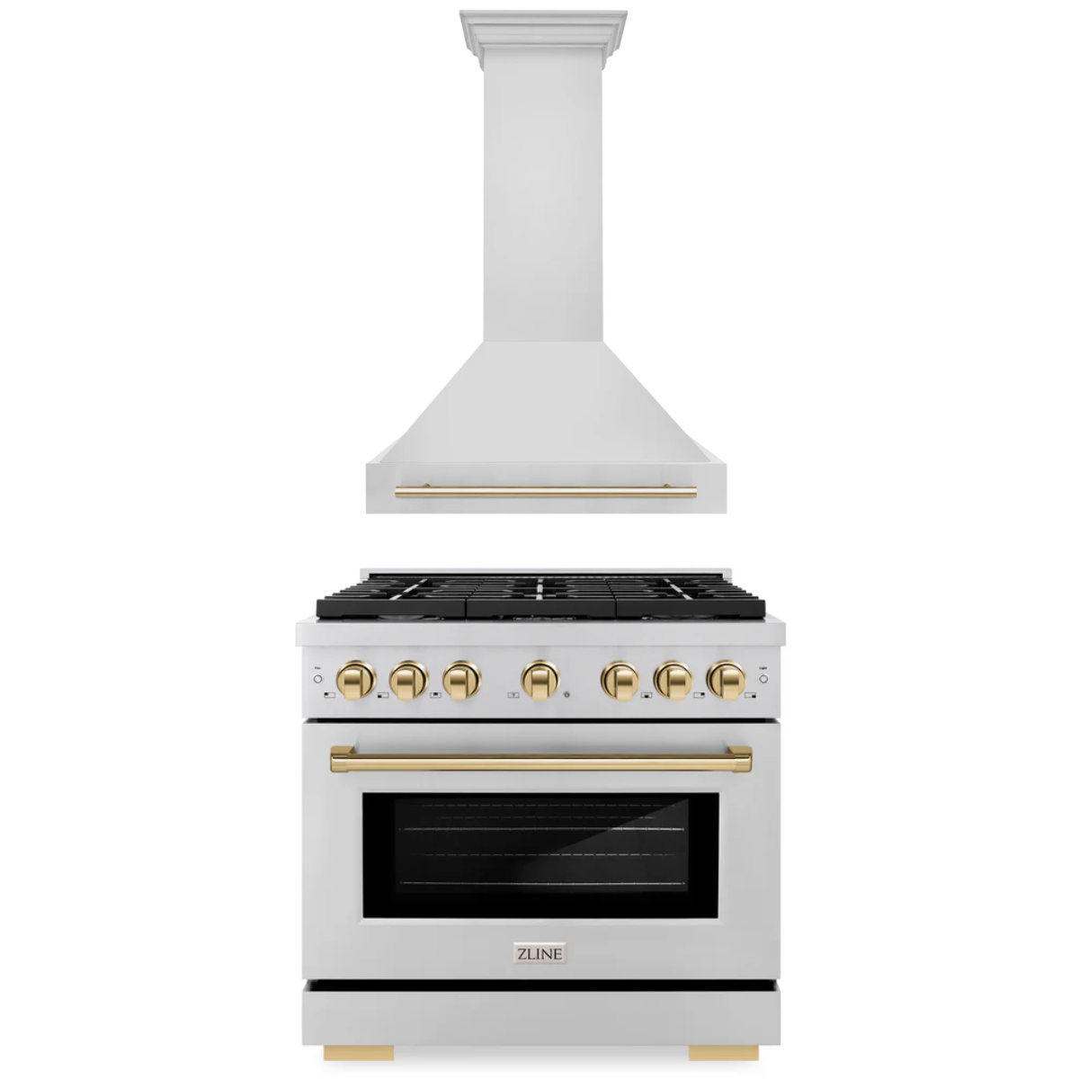 This ZLINE Kitchen Autograph Appliance Package has a powerful stainless steel 36" Gas Range and 36" Range Hood - all with eye-popping Gold Accents!