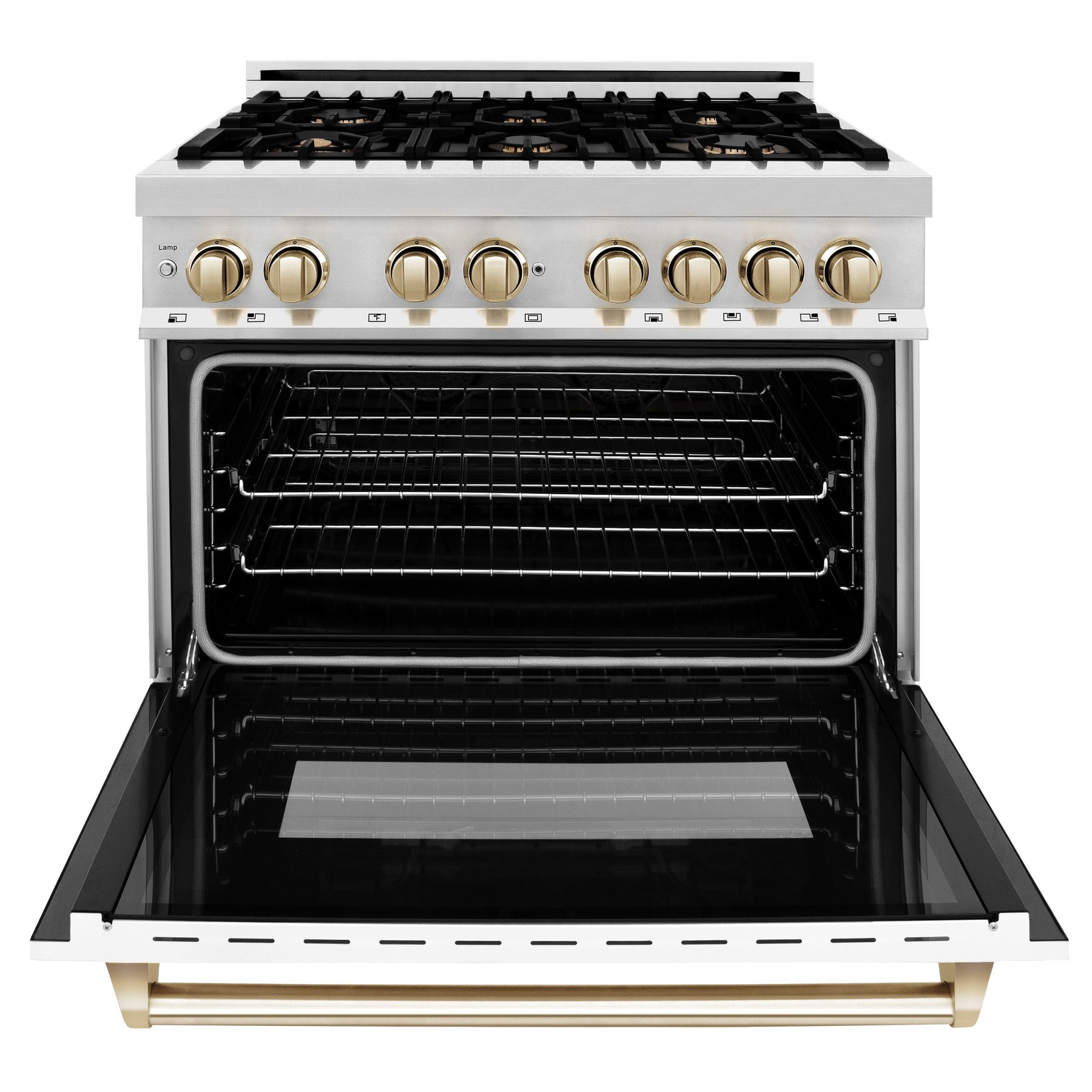 This ZLINE Kitchen Autograph Appliance Package has a powerful stainless steel 36" Dual Fuel Range and 36" Range Hood - all with eye-popping Gold Accents!